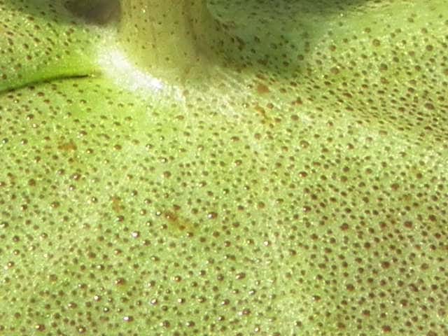 | ▼2014年6月24日 秋鹿 | ▼葉は長さ約13cm。 | ▼裏面は紫色を帯び、粒状の腺点がある。 |