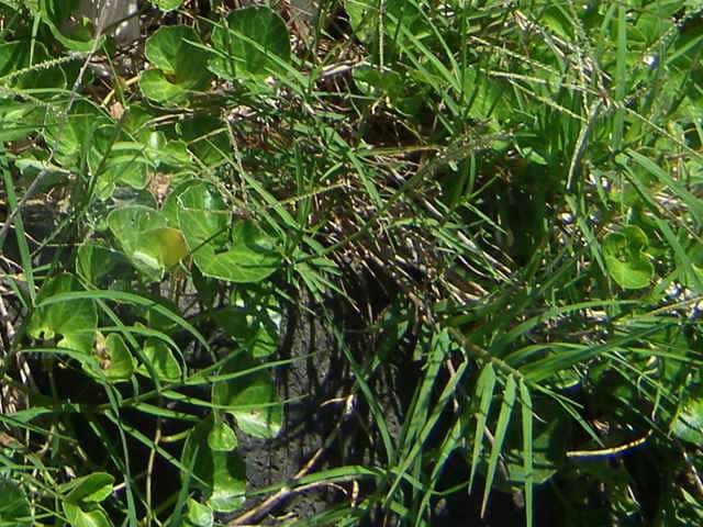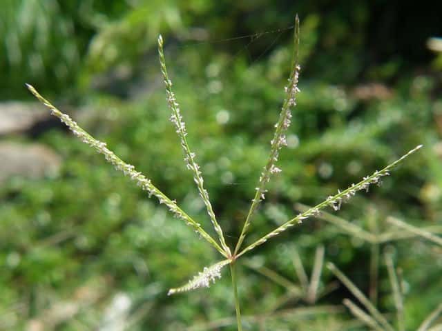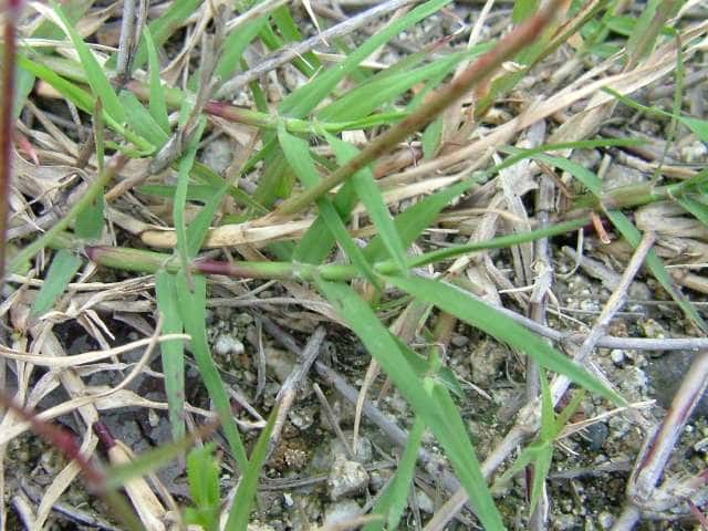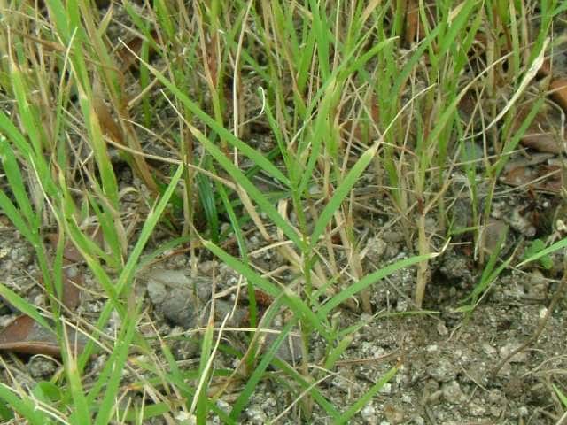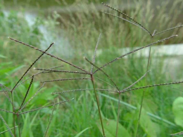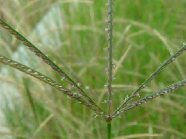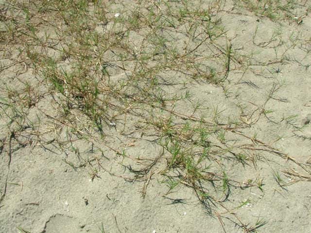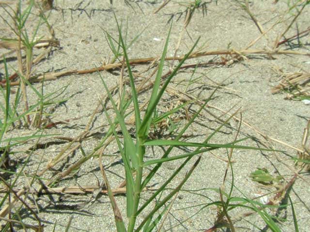 | 多年草 北海道〜沖縄の日当たりのよい路傍や原野、芝生、海浜などに生育し、群生する。分枝して長く横走する匍匐茎で繁殖する。直立茎は高さ15〜30cm、匍匐茎の節から伸び、堅く平滑。葉は長さ2〜5cm、幅1.5〜3mm、線形、無毛。葉舌は厚く膜質、長さ0.2〜0.3mm、切形で毛がある。花序は掌状に2〜7個の花軸に分かれ、長さ2.5〜5cm、花軸の片側に2列に小穂をつける。小穂は1小花からなり広卵形、長さ2.8〜3mm、光沢がなく扁平。苞穎は不同長、1脈があり鋭頭。第1苞穎は挟披針形、長さ1.5〜2mm、第2苞穎は挟披針形、彎曲し長さ2.2〜2.5mm。護穎は卵形、鈍頭、長さ2.8〜3mm、芒はなく竜骨部に圧毛を生じる。花期は6〜8月。(日本イネ科植物図譜) 学名は、Cynodon dactylon イネ科ギョウギシバ属 |
