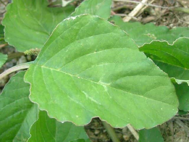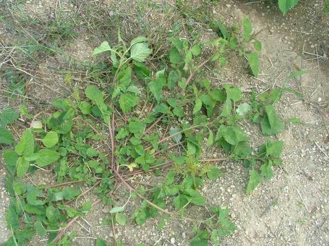 | 1年草 熱帯アメリカ原産。1921年に東京で記録され、その後、関東以西〜沖縄に広く帰化するが、それほど数は多くない。路傍や空き地などに生える。茎は基部で平伏し、多少分岐し、高さ10〜40cm。葉は互生し、柄があり、葉身は狭卵形〜卵形で長さ1〜4cm、幅0.5〜2.5cm、先はやや鈍い。花被片は2〜3個、狭長楕円形で長さ1.5〜2mm。胞果は楕円形で花被片の2倍の長さがあり、表面は平滑。種子は直径約1mmの円盤状、黒色で光沢がある。花期は夏〜秋。(日本帰化植物写真図鑑) 学名は、Amaranthus deflexus ヒユ科ヒユ属 |