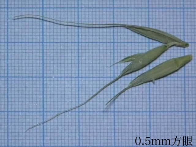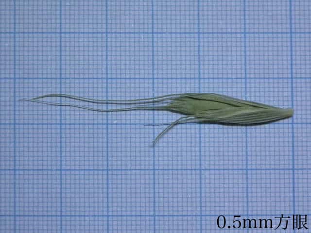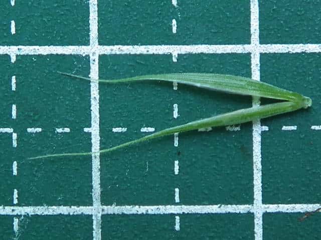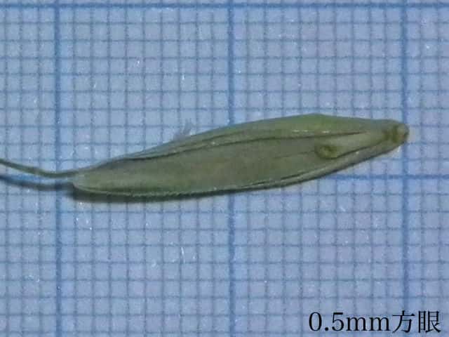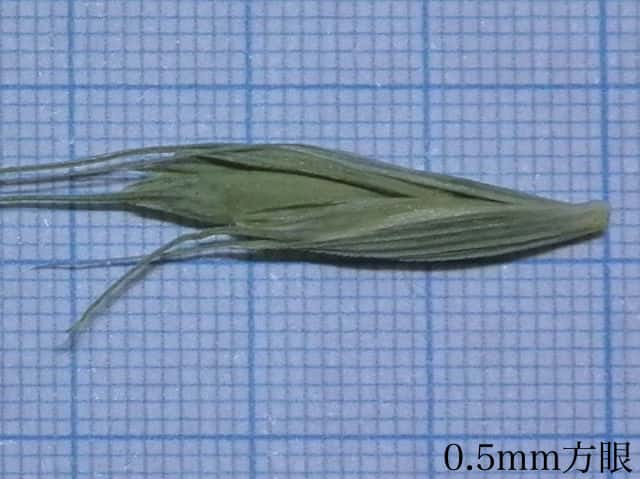 | ▼苞穎は2個がほぼ同長、先端が芒になる。 | ▼苞穎は長さ約8mm。 | |