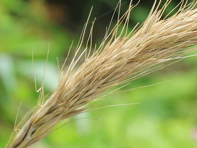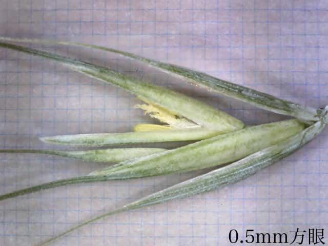 | ▼4小花があり、護穎には長い芒がある。 | ▼内穎は護穎と等長、長さ約10mm。 | ▼若い果実は長さ約5mm、頭部に毛がある。 |