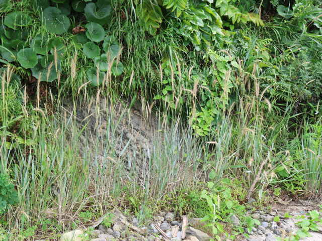 | 多年草 北海道〜九州の海岸の草原に生育し、散生またはまばらに群生する。根茎は短く、ほふく根茎を欠き、越冬芽は地表に現れる。茎は直立・叢生。葉は無毛。葉舌は短く長さ1mm。葉耳は挟三角形。成葉の葉鞘は無毛。花序は穂状、やや湾曲し長さ10〜20cm。小穂は花軸に通常双生し、長さ8〜10mm、3〜4個の小花からなる。苞穎は被針形、ほぼ同長、7〜11mm、有芒。護穎は披針形、3〜5脈があり、長さ8〜10mm、先は長さ10〜20mmの芒となる。芒は少し外側に屈曲する。内穎は護穎と等長。果実は黄褐色、頭部に白毛を被り長さ5〜6mm。花期は7月。(日本イネ科植物図譜) 学名は、Elymus dahuricus イネ科エゾムギ属 |
