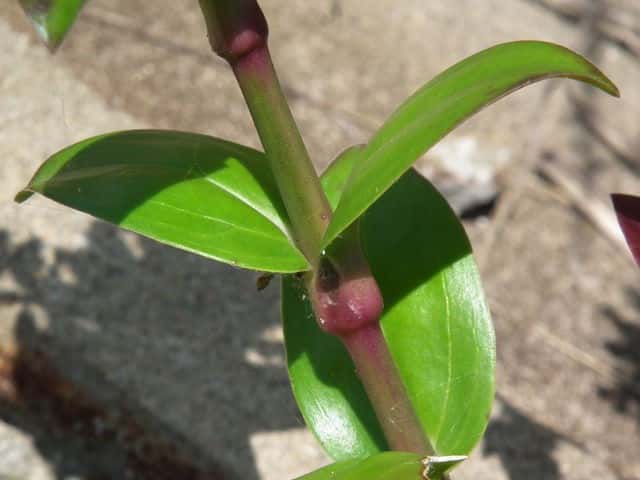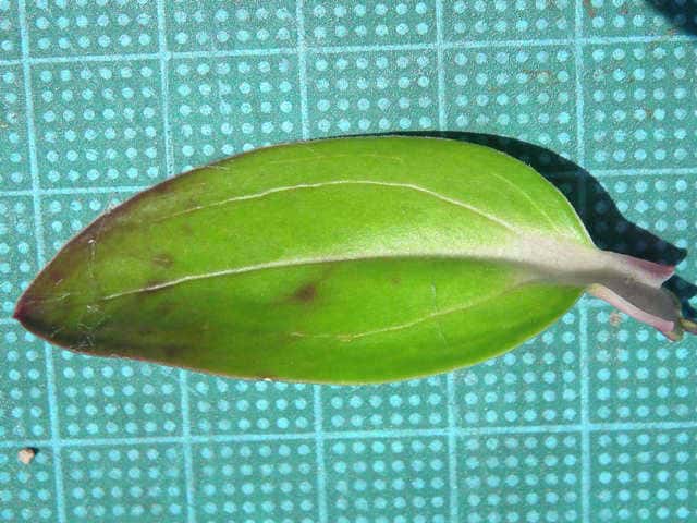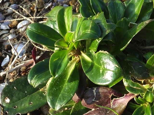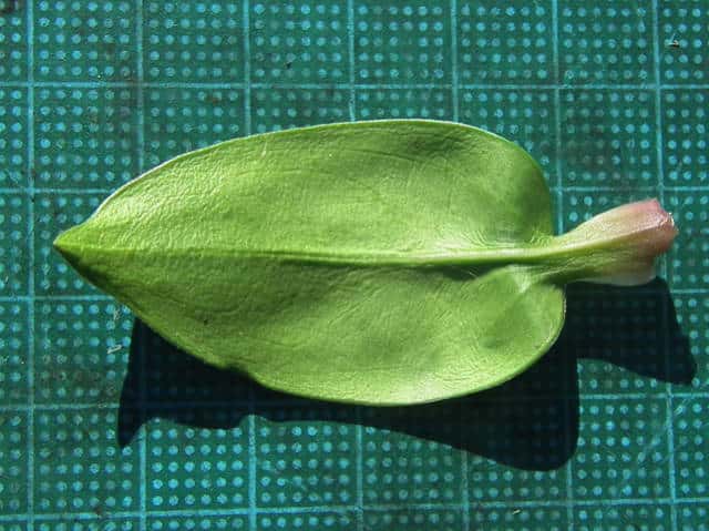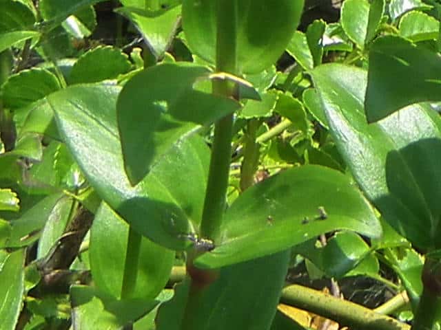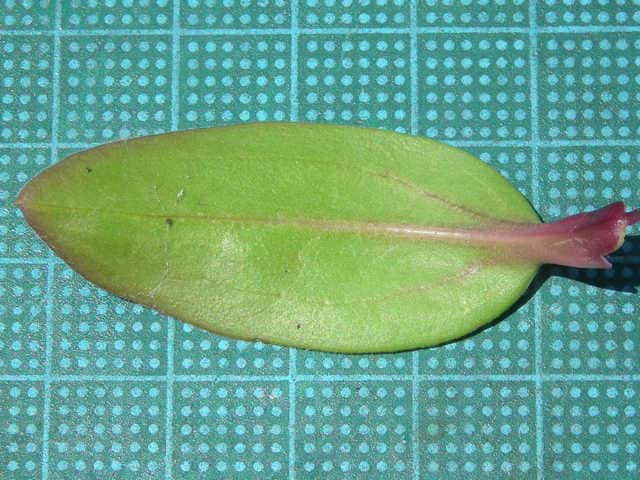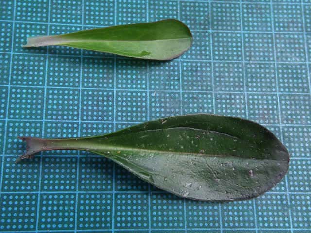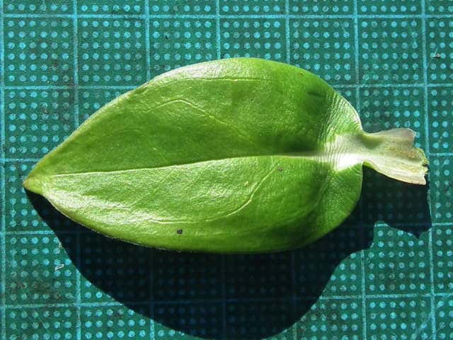| ▼葉の基部は合着し茎を包む。 | ▼葉は長さ約4cm、厚く光沢がある。 | |