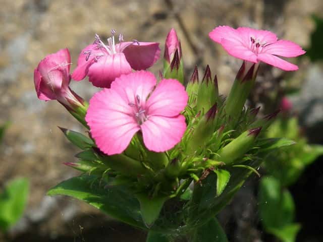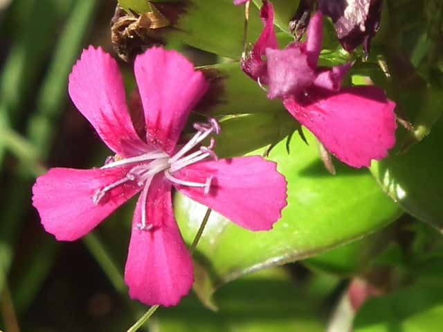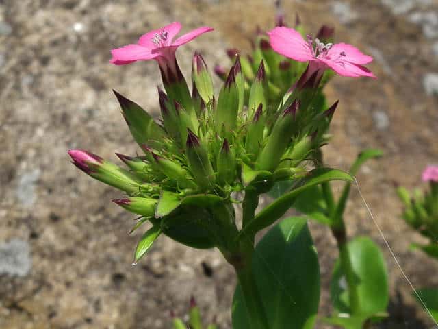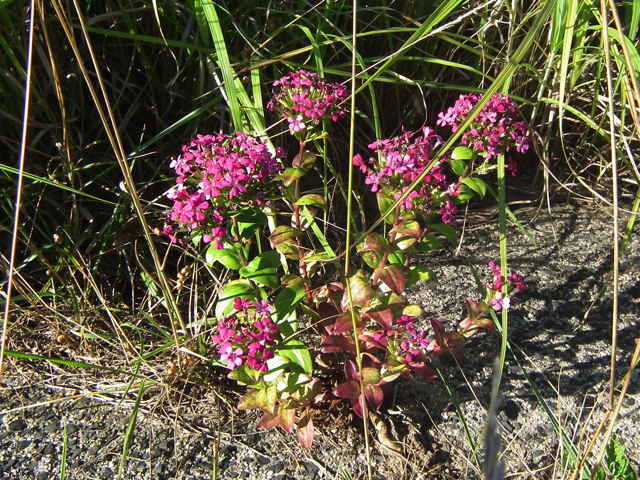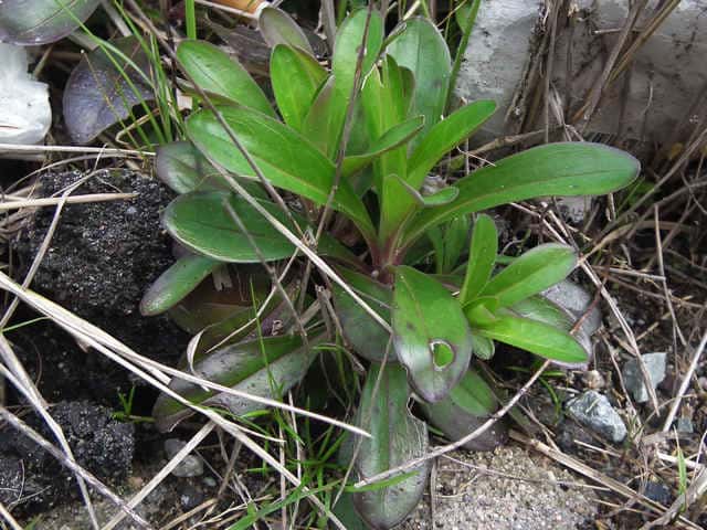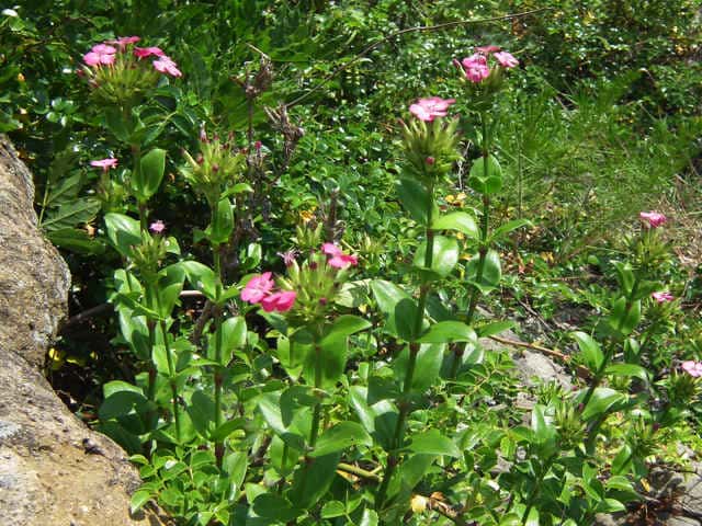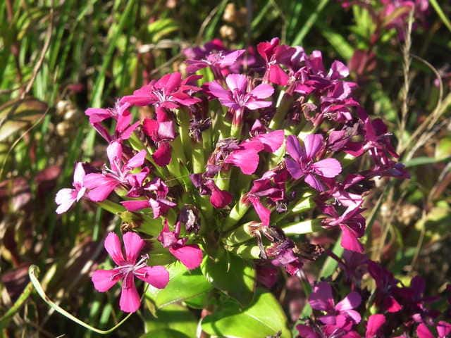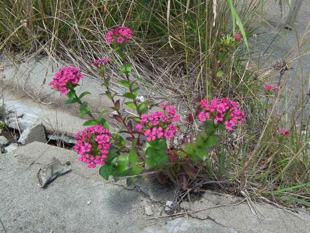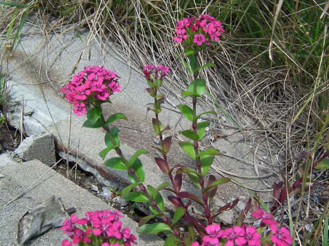 | 多年草 本州〜九州の海岸に生える。茎は叢生して下部は木質化し、上部は直立して無毛、高さ15〜50cm。根出葉はロゼットとなり、倒披針形、長さ5〜9cm。、茎葉は長楕円状披針形、または卵状披針形、長さ5〜9cm、鈍頭または鋭頭、葉柄は6〜8mm、基部でひっついて1.5〜3mmの筒となり、質厚く両面無毛で、ふちに縁毛がある。花は多数が密に集まって、集散花序となる。苞は3対、長楕円形で先に5〜6mmの草質の尾がつく。萼は長さ19〜21mm、花弁は紅紫色、先は歯牙縁。さく果は萼筒より少し長い。種子は黒色1.5〜2mm。花期は6〜11月。(原色日本植物図鑑) 学名は、Dianthus japonicus ナデシコ科ナデシコ属 |