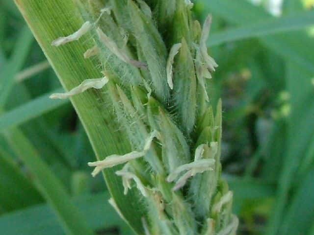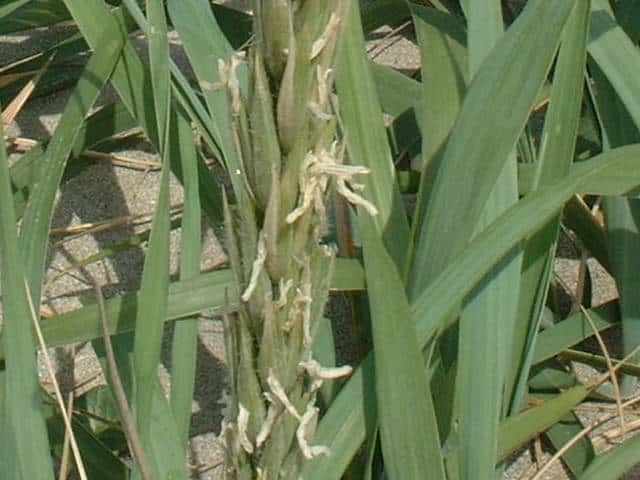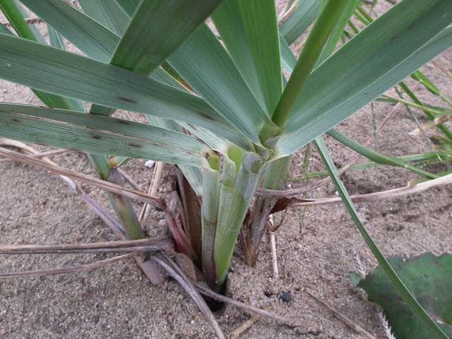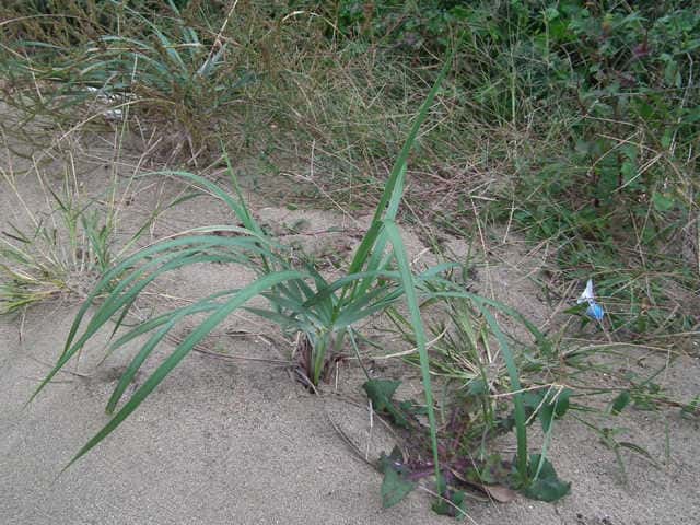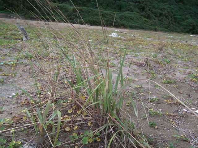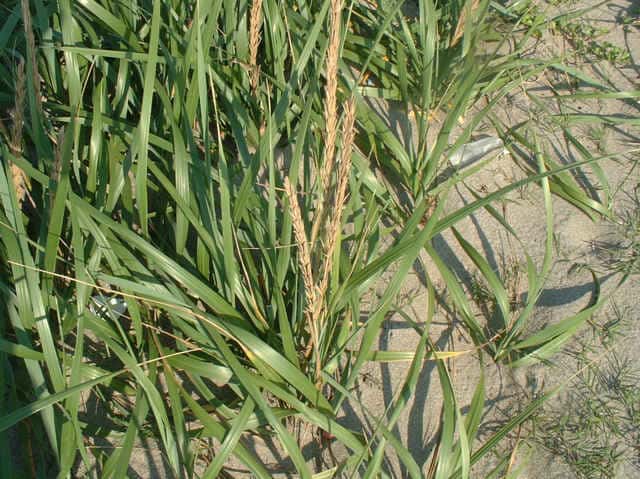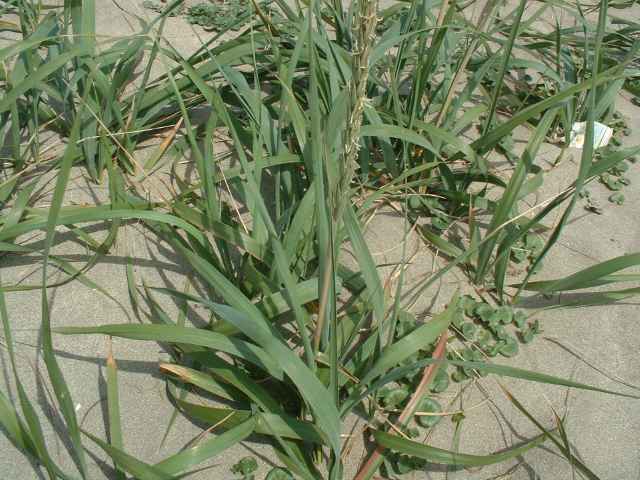 | 多年草 北海道〜九州の海浜の砂丘に生育し、著しく群生する。根茎は太く、砂中深く埋もれて横に長くはい、また、新しい匍匐根茎をのばしてその先に越冬芽を上向きにつける。茎は高さ80〜150cm、直立しやや叢生する。葉は長さ20〜50cm、幅10〜18mm、広線形、緑白色および厚い。花序は直立し単一の穂状、長さ15〜25cm、径15〜20mm、淡黄緑色、短い軟毛がある。小穂は通常1節に2個つき、3〜5小花からなり、長さ10〜25mm。護穎はほとんど無芒。果実は線状倒披針形、頭部に2個の小突起をつけ、毛を被り、淡褐色を帯び長さ7〜8mm。別名ハマニンニク。花期は6〜7月。(日本イネ科植物図譜) 学名は、Leymus mollis イネ科テンキグサ属 |