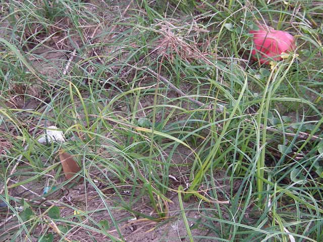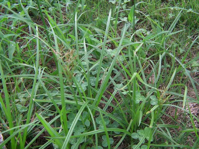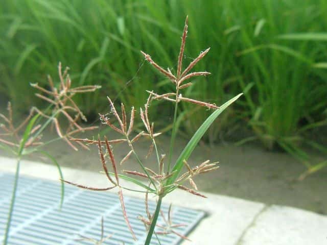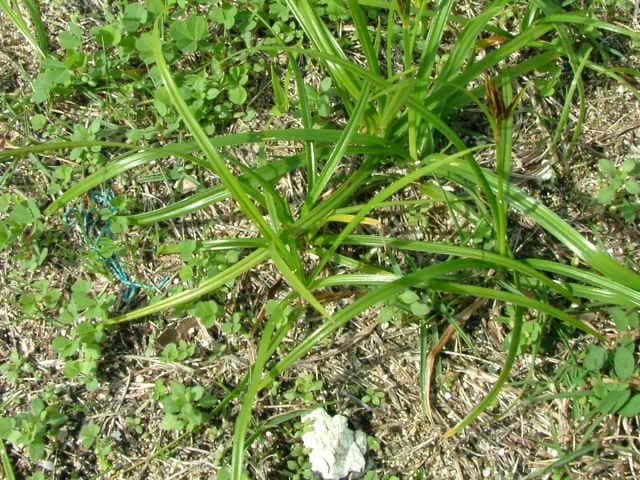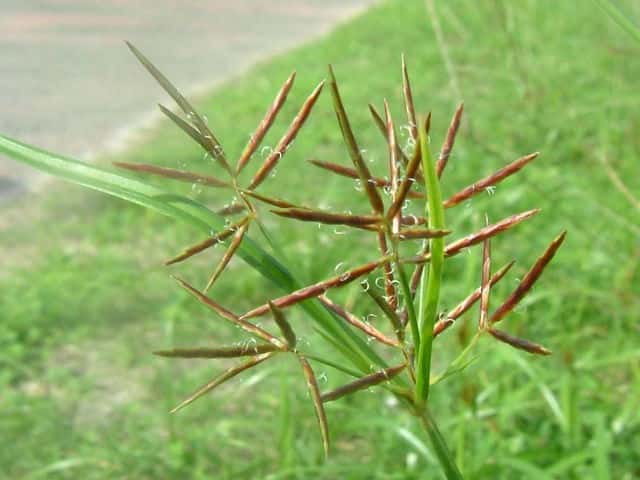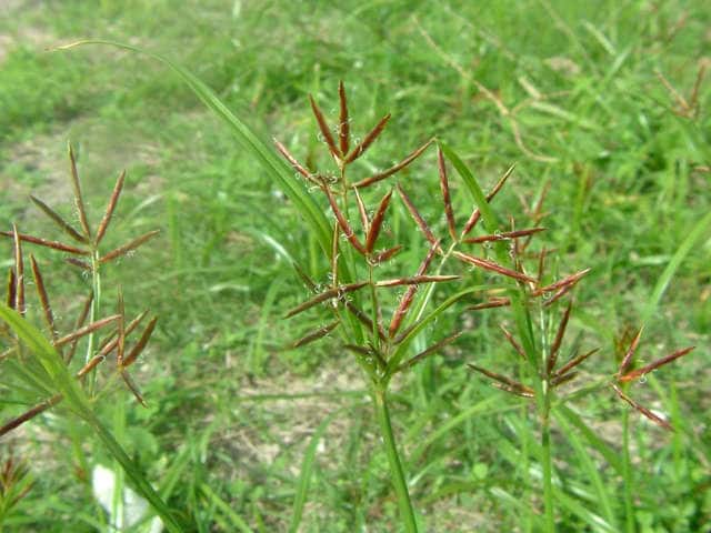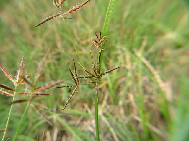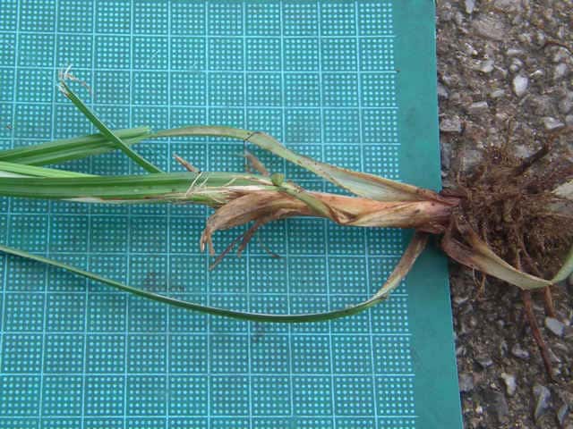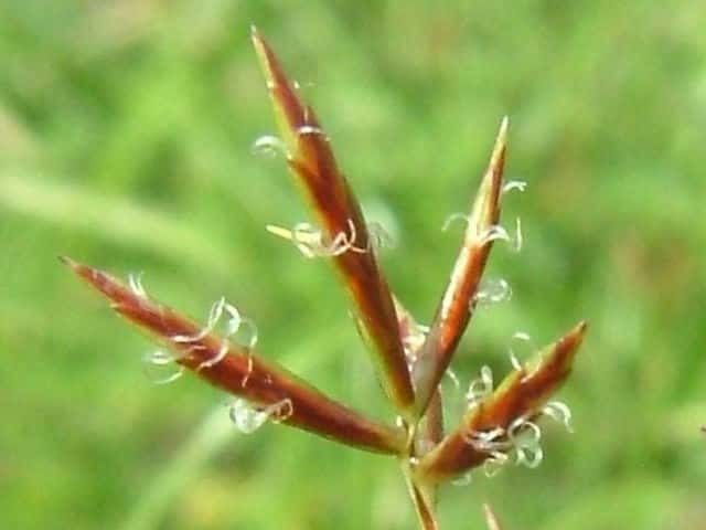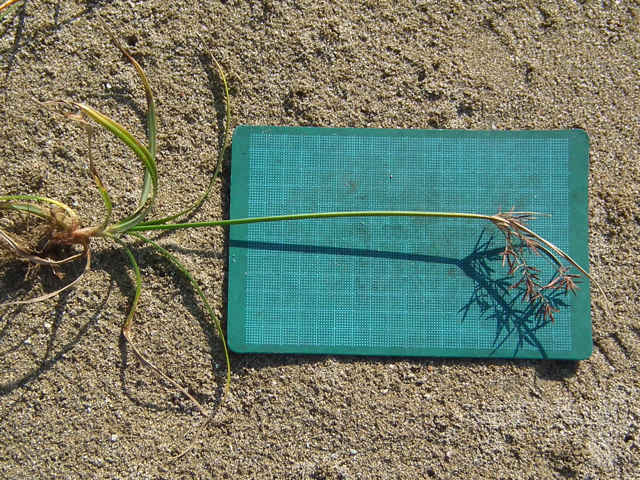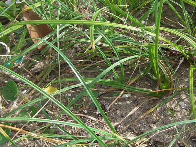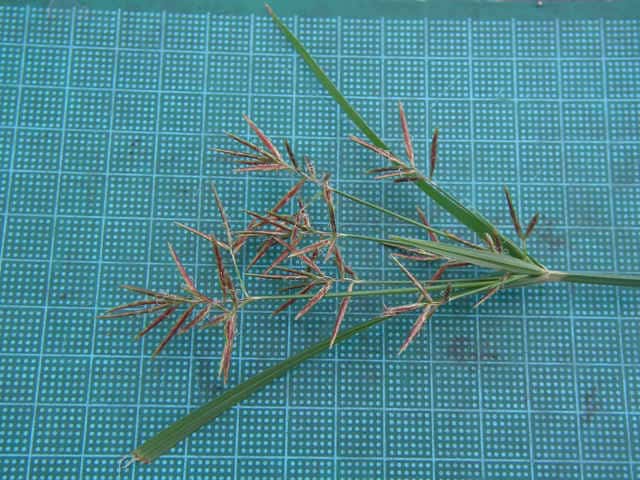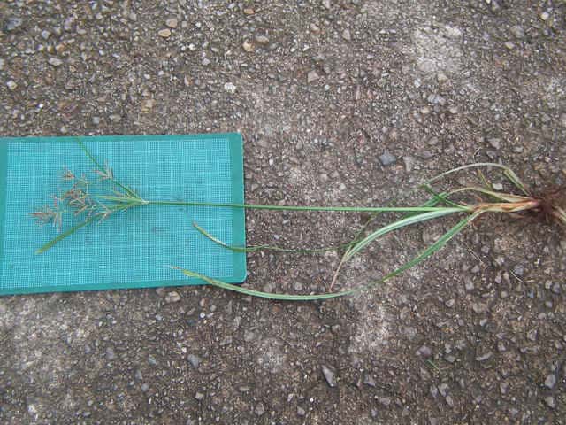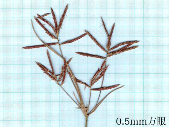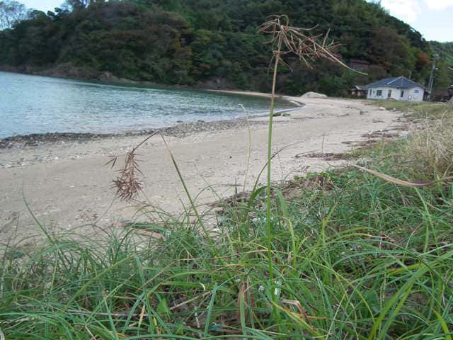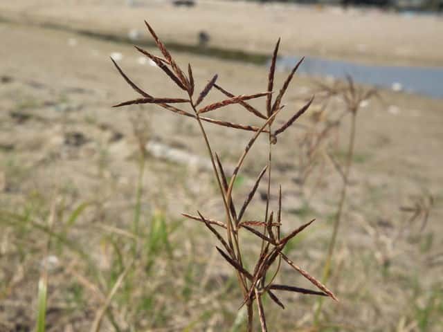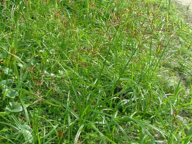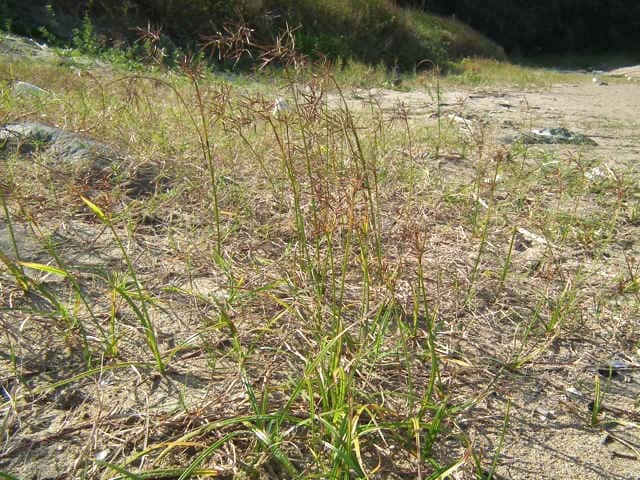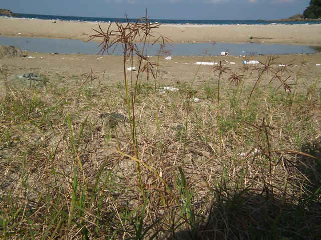 | 多年草 関東地方以西〜九州の日当たりのよい海岸の砂地から平地の路傍まで広く分布する。花期後、稈の基部や細長い匐枝の先端に球状の塊茎をつくる。稈は細くて硬く、高さ10〜40cm。葉は幅2〜5mm。花序は単一。花序枝は2〜8本。苞葉の葉身は2〜3枚、花序とほぼ同長。花穂はやや疎または3〜8個の小穂をつける。小穂は線形、長さ1.5〜2cm、中軸に斜開してつき、光沢があり、赤褐色、やや疎らに20〜40個の花をつける。鱗片は狭卵形、斜上してつき、長さ3〜3.5mm、紅褐色、鈍頭〜円頭、中肋はあまり目立たず緑色。そう果は長楕円形、長さ約1.2mm。花柱は長さ約1.5mm。柱頭は3個。花期は7〜10月。(岡山県カヤツリグサ科植物図譜) 学名は、Cyperus rotundus カヤツリグサ科カヤツリグサ属 |