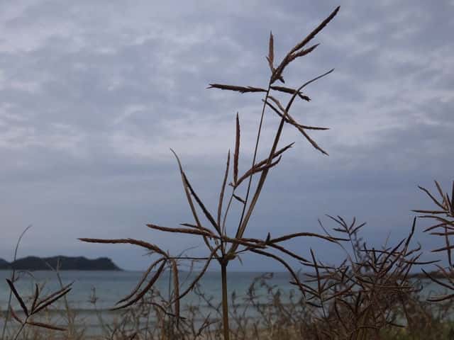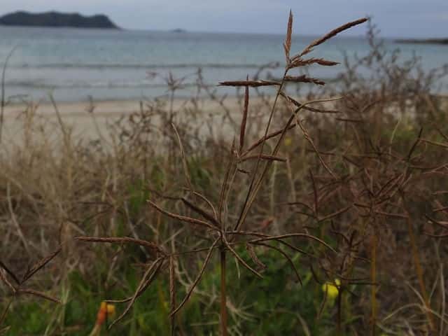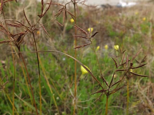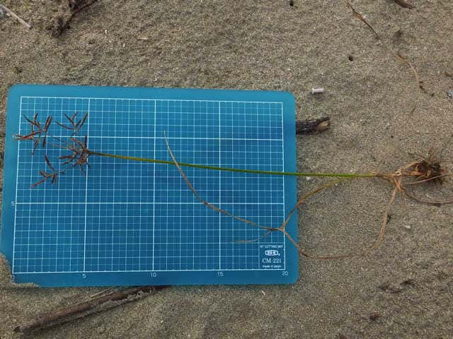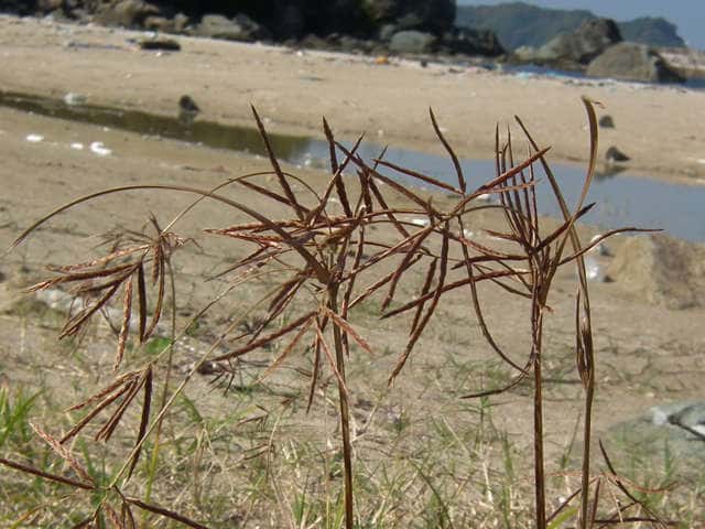 | ▼2012年10月21日 美保関 | ▼枝の先に線形の小穂が7個ある。 | ▼茎の先に花序より長い苞がある。 |