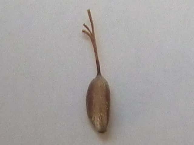| ▼果実は鱗片の1/3の長さ。 | ▼果実は長さ約1.3mmで、3稜がある。 | ▼柱頭は3岐する。 |