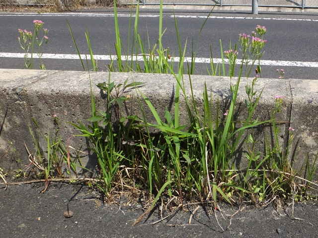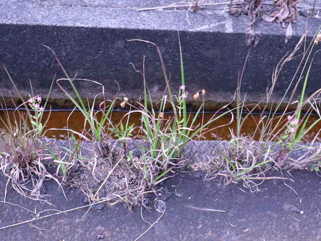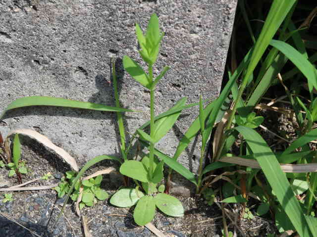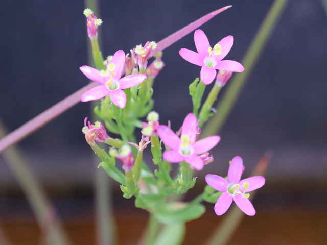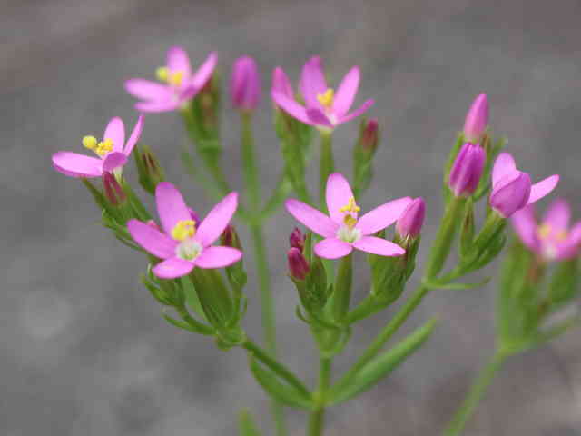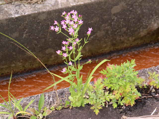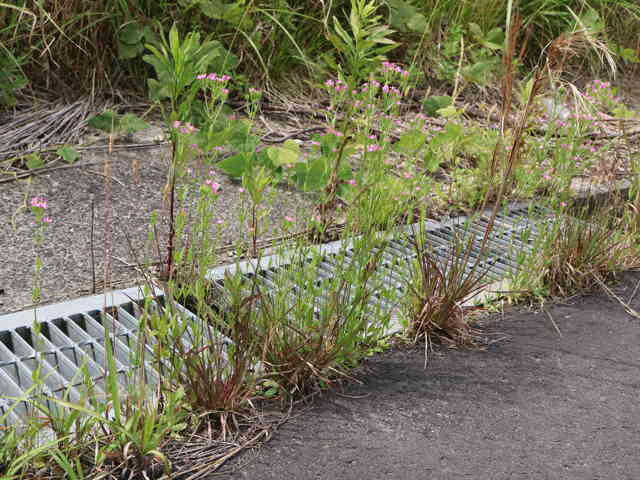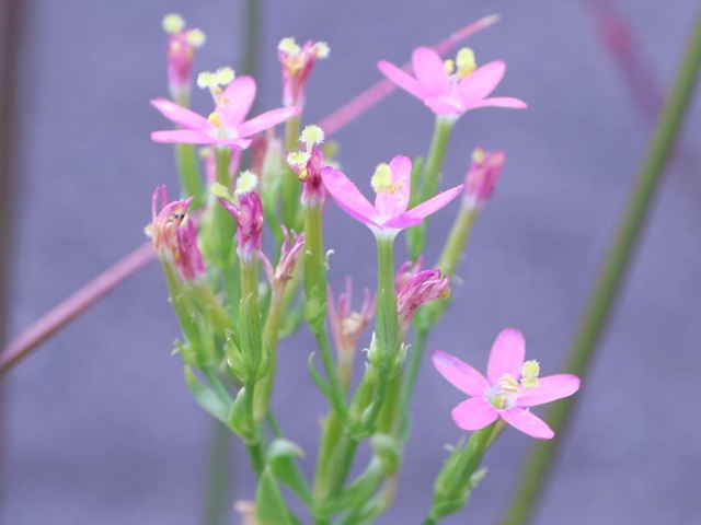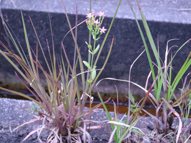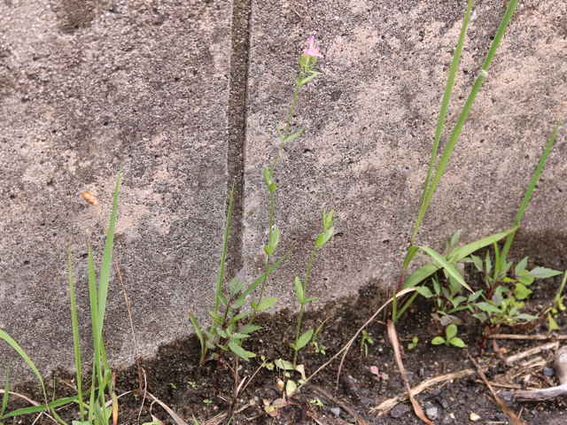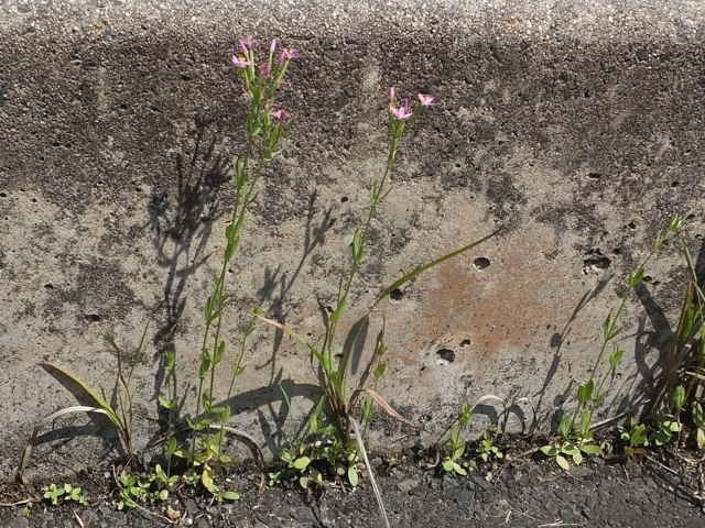 | 1〜越年草 地中海沿岸の原産で北アメリカなどに帰化している。全体無毛。茎は4稜で中空、直立してよく分岐し、高さ20cmほどになる。葉は先の尖った倒卵形で全縁、根生葉はロゼットを形成しない。無柄で対生する。茎の上部でよく分岐し、直径8mmほどの桃色の5裂した花を多数つける。花期は6〜7月。(日本帰化植物写真図鑑) 学名は、Centaurium tenuiflorum リンドウ科シマセンブリ属 よく似たベニバナセンブリは花の直径が11〜13mmと大きく、普通、花期にも根生葉がロゼット状に残る。また花冠の裂片と筒部の比は、ほぼ1:1となる。 |