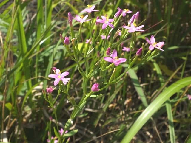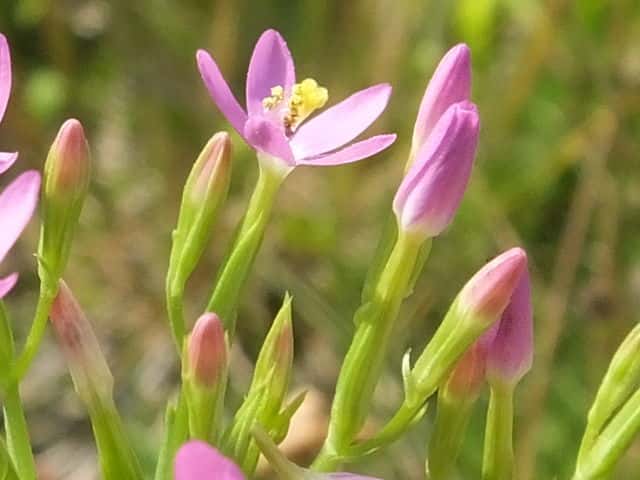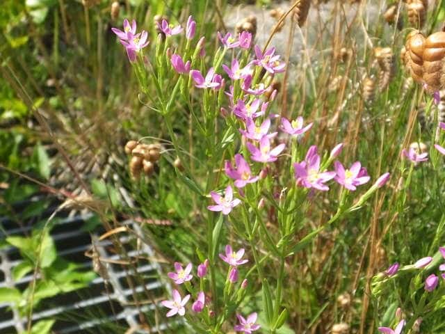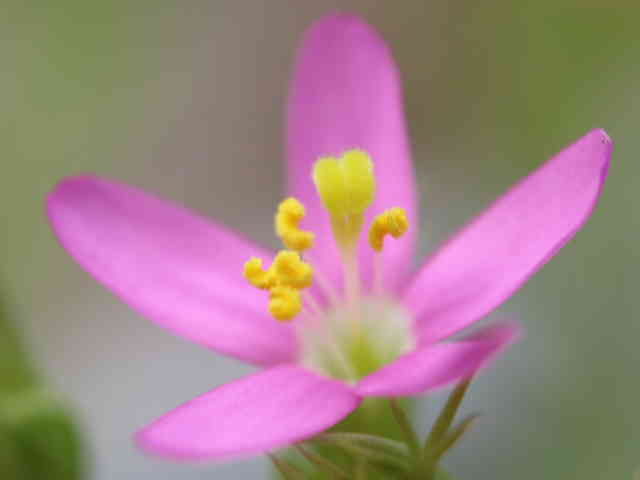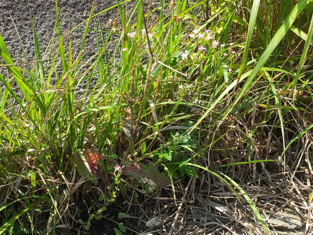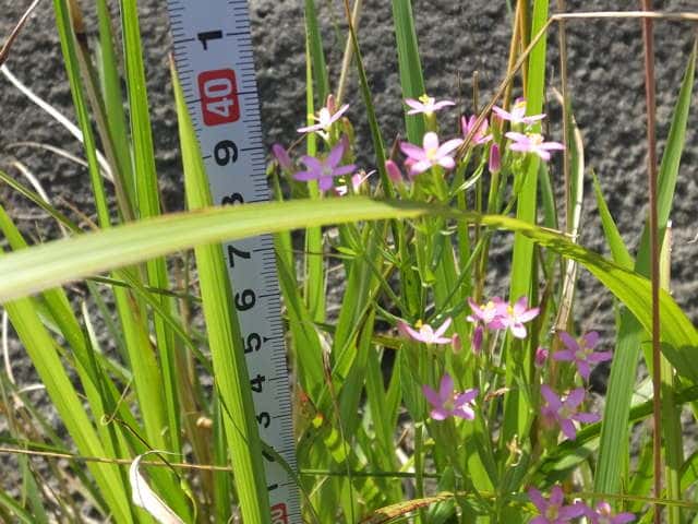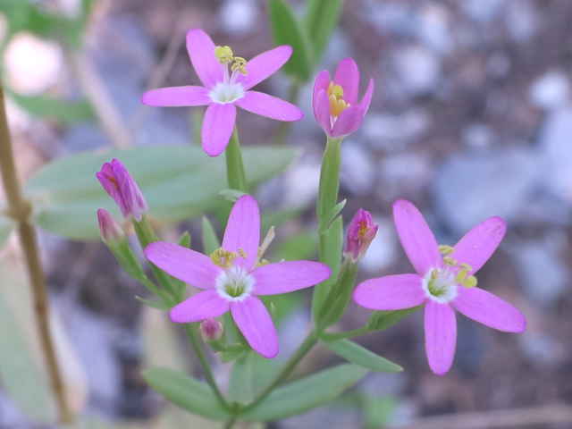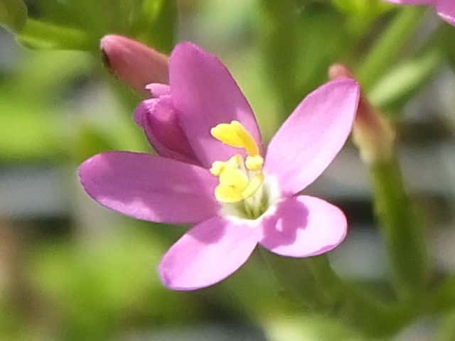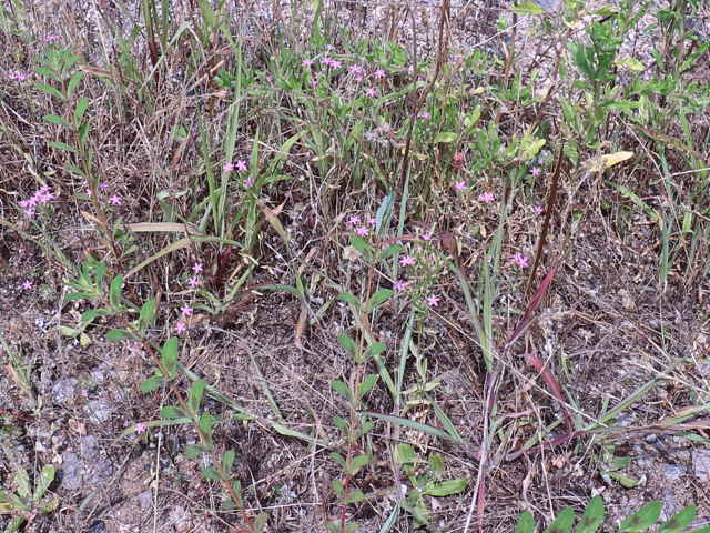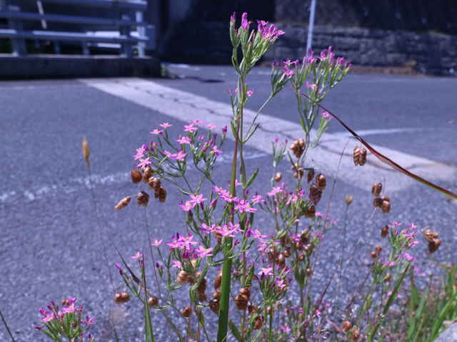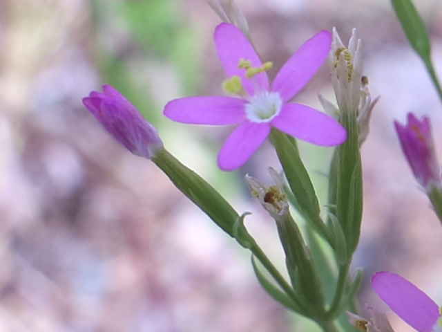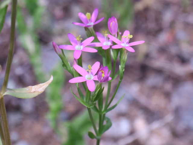 | 1〜越年草 地中海沿岸の原産で北アメリカなどに帰化している。全体無毛。茎は4稜で中空、直立してよく分岐し、高さ20cmほどになる。葉は先の尖った倒卵形で全縁、根生葉はロゼットを形成しない。無柄で対生する。茎の上部でよく分岐し、直径8mmほどの桃色の5裂した花を多数つける。花期は6〜7月。(日本帰化植物写真図鑑) 学名は、Centaurium tenuiflorum リンドウ科シマセンブリ属 よく似たベニバナセンブリは花の直径が11〜13mmと大きく、普通、花期にも根生葉がロゼット状に残る。また花冠の裂片と筒部の比は、ほぼ1:1となる。 |