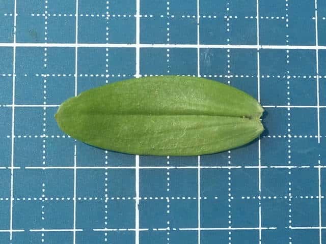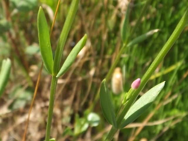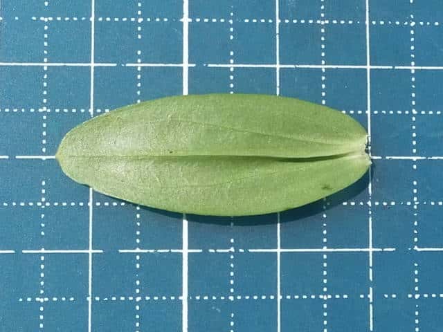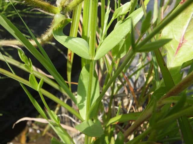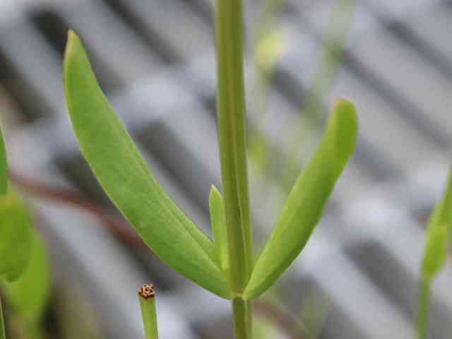 | ▼葉は対生し、先端が尖る。 | v▼葉は十字対生する。 | 茎葉は長さ約3.4cm、全縁。 |