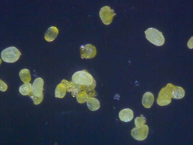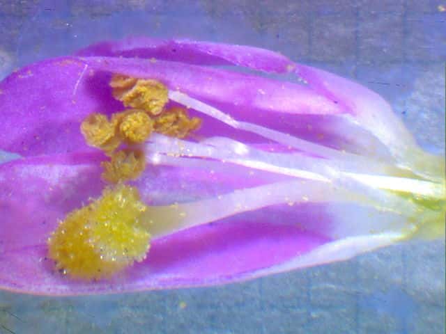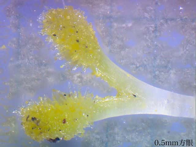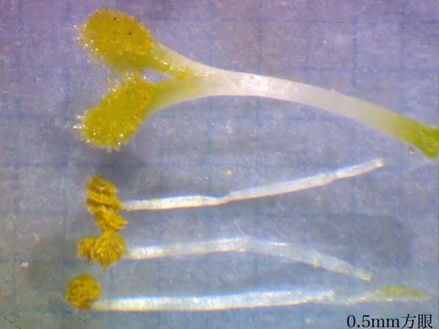 | ▼捩じれて花粉を出す葯。 | ▼花粉は俵型。 | ▼俵型以外に小さな花粉が多くある。 |