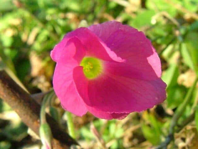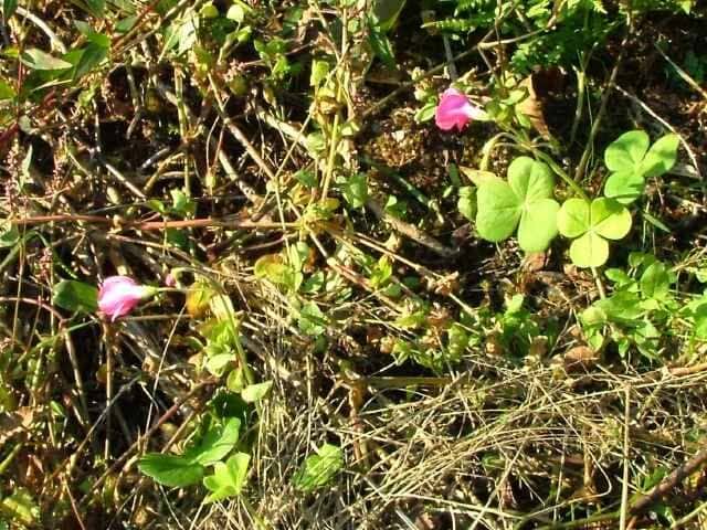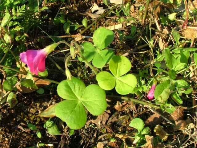 | 多年草 南アフリカ原産。江戸時代の末以降で鑑賞用に渡来し、四国、九州などの暖地で野生化している。根茎の先にできる紡錘形の塊茎から長さ15cmほどの柄のある、倒心形の3小葉からなる葉を数本だす。葉の裏面はやや白色を帯び、葉柄や花茎に微毛が密生する。葉の間から長い花茎を出し、直径3cmほどの淡紅色の5弁花を10個ほどつける。花期は夏〜秋。(日本帰化植物写真図鑑) 学名は、Oxalis bowiei カタバミ科カタバミ属 |