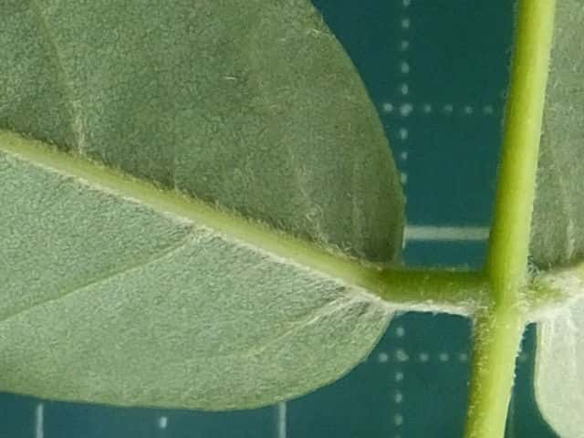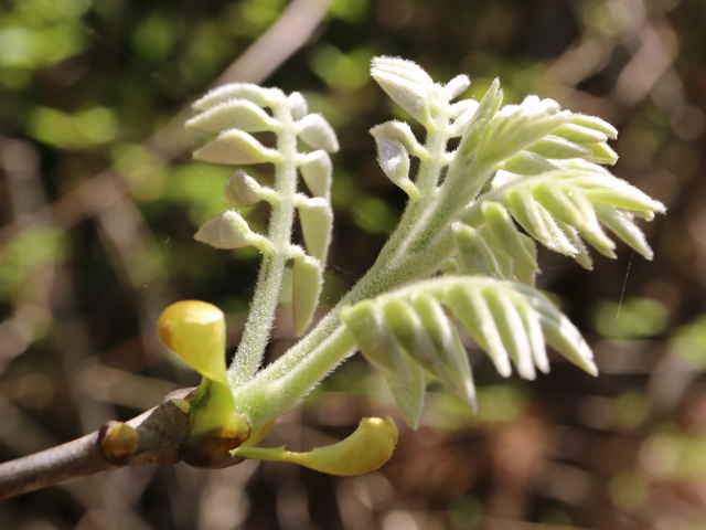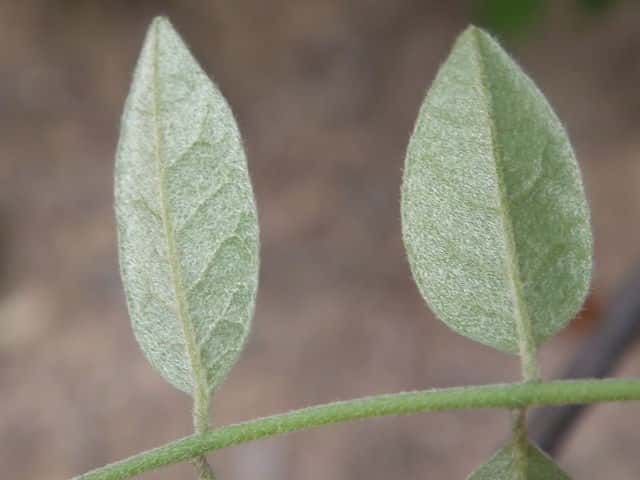 | ▼葉の表面は伏毛があり、葉柄、葉軸に毛が密生する。 | ||