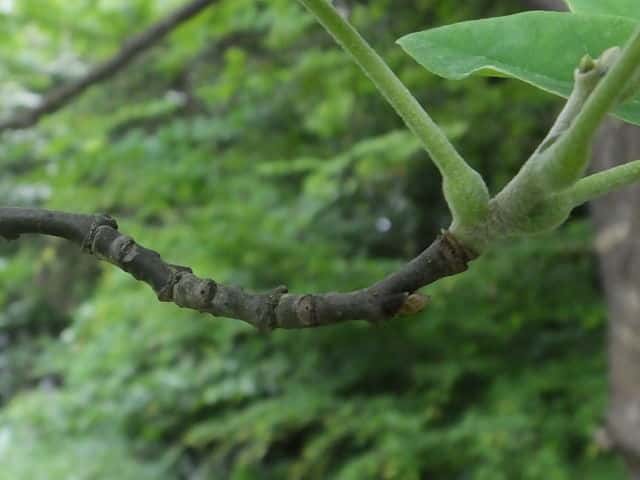 | ▼裏面は毛が密生する。 | ▼葉痕は半円形、維管束痕は3個。 | |