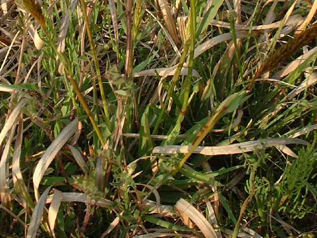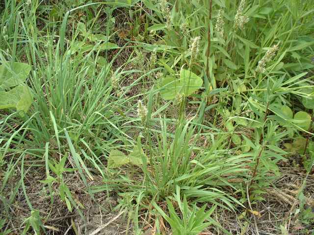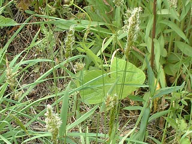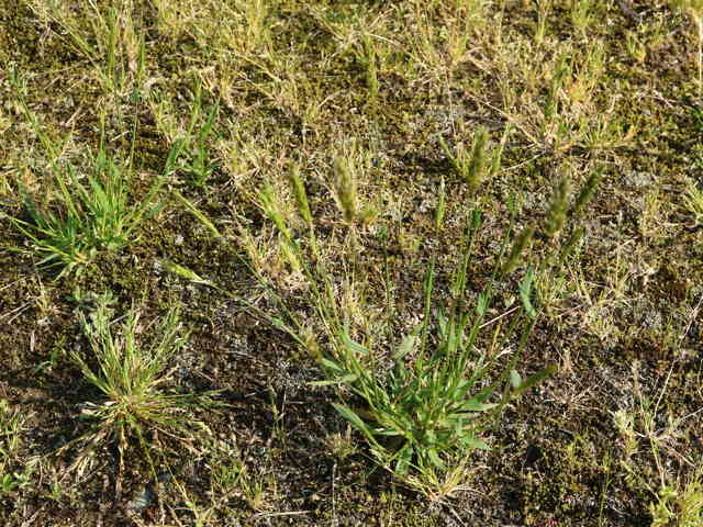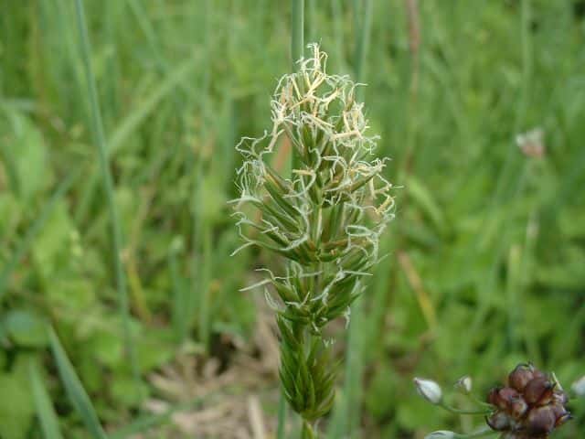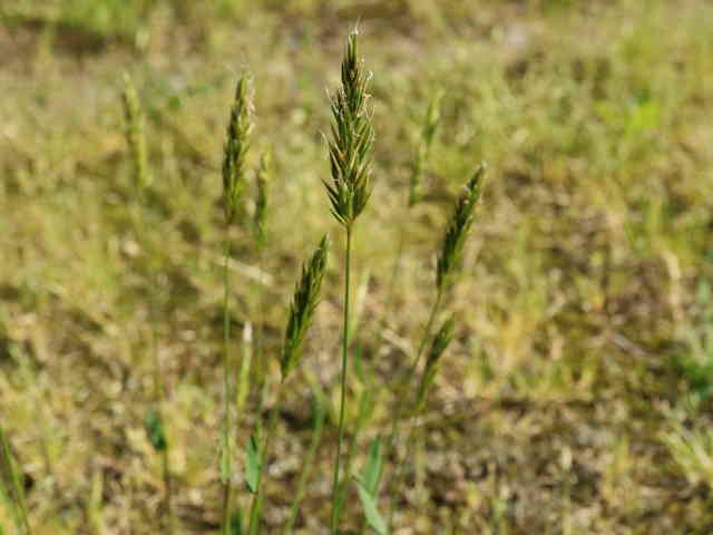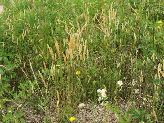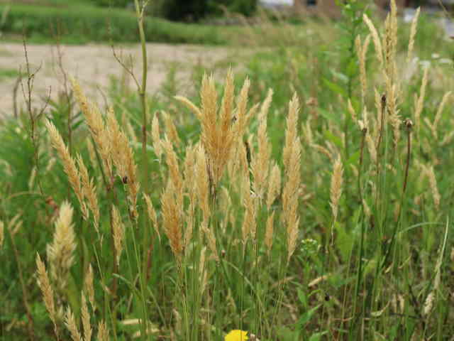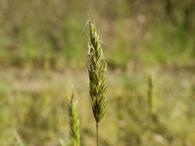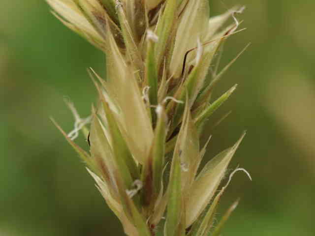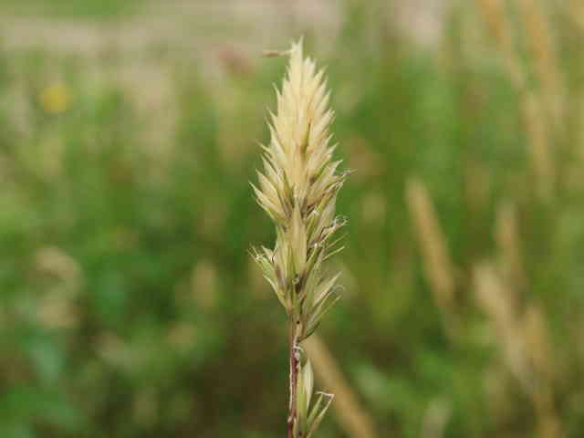 | 多年草 ヨーロッパ原産。路傍や庭園、原野などに生育し、やや密に群生する。茎は叢生し直立する。高さ30〜60cm。葉は長さ5〜10cm、幅3〜6mm。柔らかく、両面に長い毛がある。葉舌は鋭形、長さ2〜2.5mm。葉鞘は無毛。花序は穂状、長さ3〜7cm。小穂は線状披針形、長さ8〜9mm、光沢があり芒をつける。1小穂3小花であるが、第1と第2小花は退化して、護穎のみとなる。花期には第2包穎の先に、退化した第2小花の芒と第3小花の2本の柱頭が現れる。第3小花は両性、護穎と内穎は平滑、無毛。果実は長さ1.4〜1.7mm。花期は5〜7月。(日本イネ科植物図譜) 学名は、Anthoxanthum odoratum イネ科ハルガヤ属 |