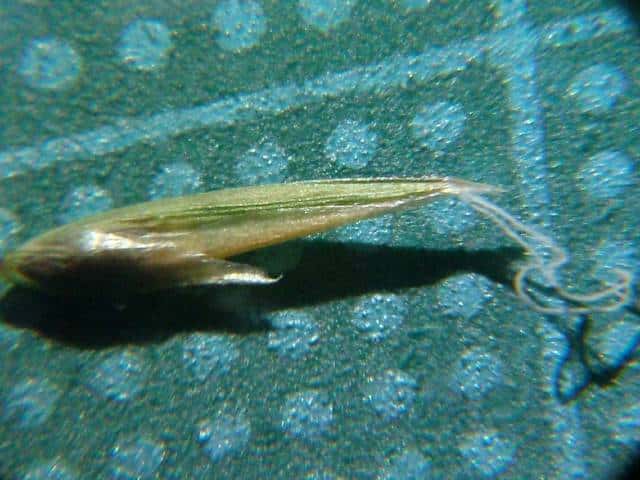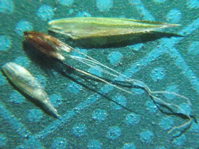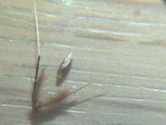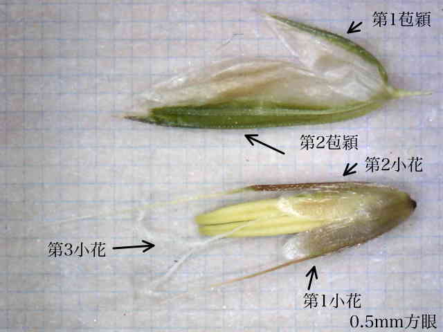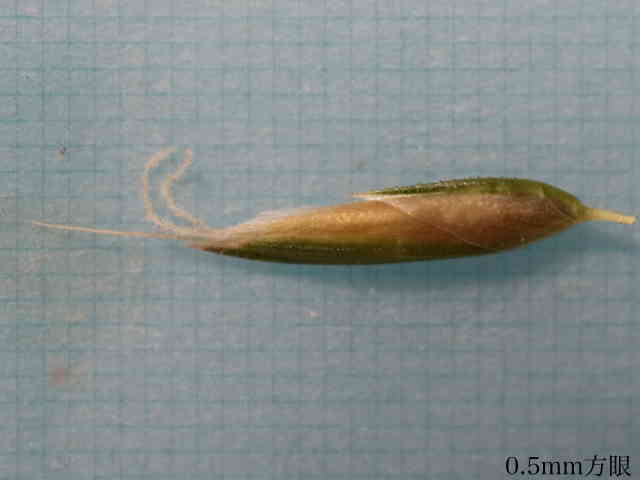 | ▼第1、第2小花の護穎は芒がある。 | ▼第1、第2小花の護穎は有毛。 | ▼第1小花の護穎を除くと果実が見える。 |