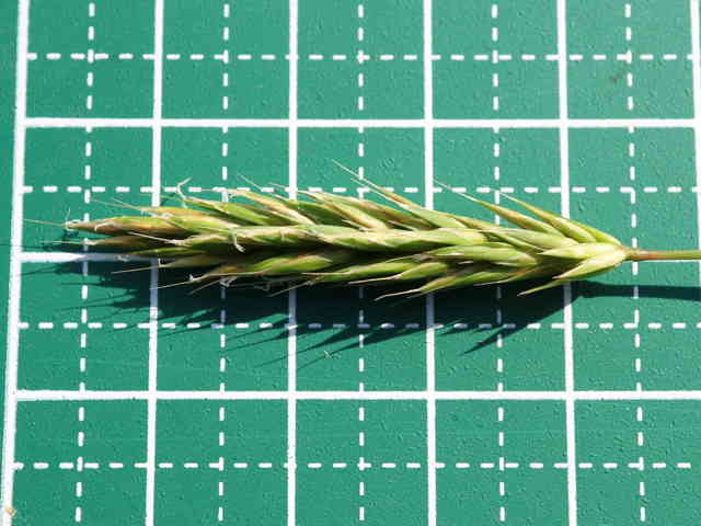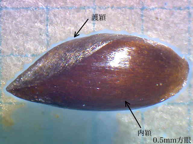 | ▼花序は長さ約4cm。 | ▼小穂の第2苞穎は長さ約7mm。 | ▼苞穎を除くと第1、第2小花の護穎に包まれた果実がある。 |