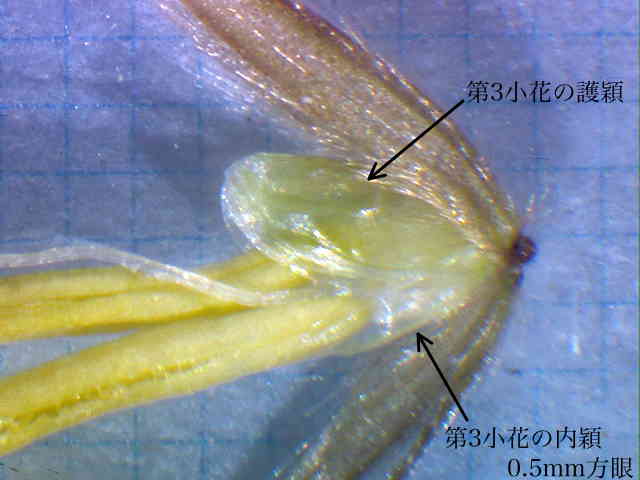 | ▼退化した第1、第2小花の護穎は芒がある。 | ▼第3小花の護穎と内穎は小さく、無毛。 | |
