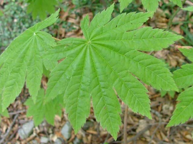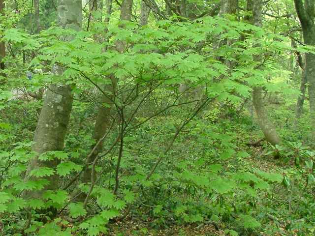 | 落葉高木 北海道〜本州の山地の谷間や谷間に続く斜面に多い。関東地方では標高900〜1800mに生育する。高さ5〜10m、直径20〜30mになる。樹皮は灰青色または帯灰褐色。成木では浅く縦に裂ける。本年枝は紅紫色または赤褐色。無毛で光沢がある。葉は対生。葉身は直径7〜12cmで、掌状に浅く7〜11に浅裂または中裂する。基部はハート形。裂片は挟卵形で先は鋭くとがり、ふちには重鋸歯がある。葉質はやや厚い。若葉は両面に白色の軟毛があるが、成葉では裏面の主脈および脈腋に毛が残る。葉柄は葉身の2分の1〜4分の1の長さで、白色の軟毛がある。雌雄同株。一つの花序に雄花と両性花が混生する。紅紫色の小さな花を複散房花序に10〜15個つける。花序は有毛。花弁と萼片は5個。雄しべは8個。葯は黄色。果実は翼果。分果は長さ約2〜2.5cm、ほぼ水平から鈍角に開き、ふつう軟毛がある。7〜9月に熟す。花期は4〜5月。 冬芽の芽鱗はふつう4対。下部は黄白色の膜質の鱗片に包まれ、鱗片の内側には長い毛が生える。頂芽はふつうできず、枝先に仮頂芽が2個つく。(樹に咲く花) 学名は、Acer japonicum ムクロジ科カエデ属 |