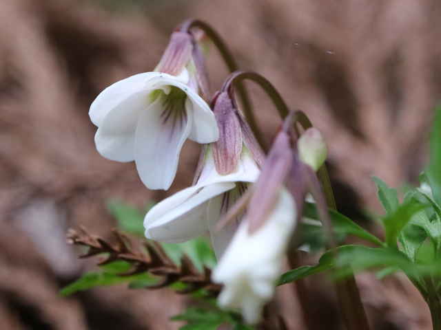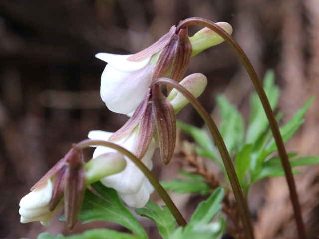 | 多年草 宮城県以南〜九州の山地の日当たりのよい草地や林内などに生える。葉は3全裂し、側裂片はさらに全裂し、5全裂状となる。小葉はさらに細かく切れ込む。花は直径1.5cm〜2cm、白色まれに淡紅色で芳香のあるものが多い。側弁は有毛。距は長さ4〜6mm。花期は3〜5月。(山に咲く花) 学名は、Viola chaerophylloides var. sieboldiana スミレ科スミレ属 スミレの分類 |