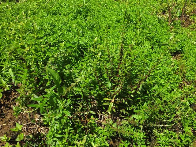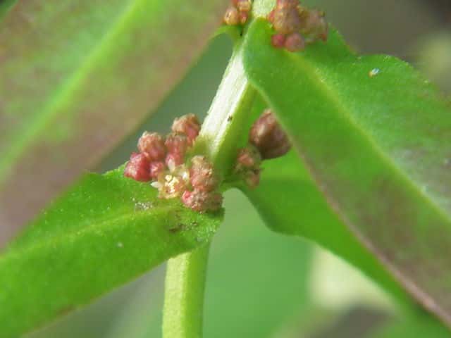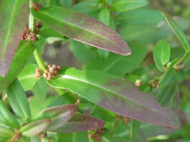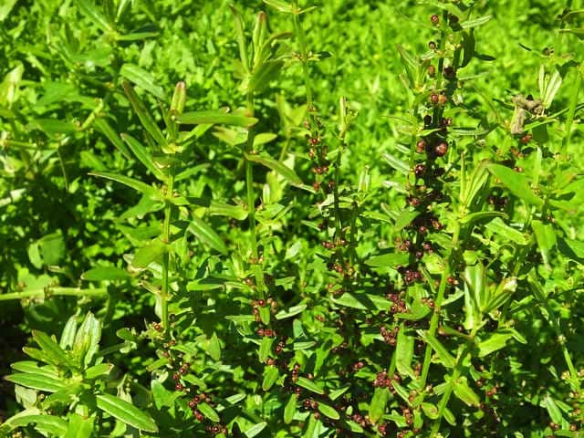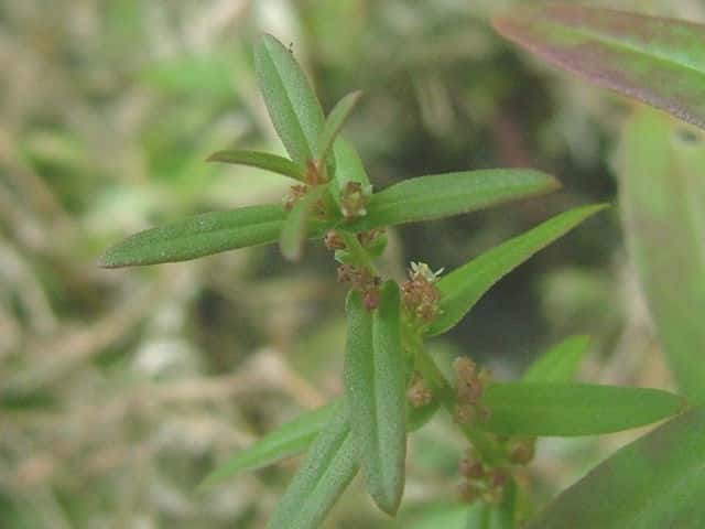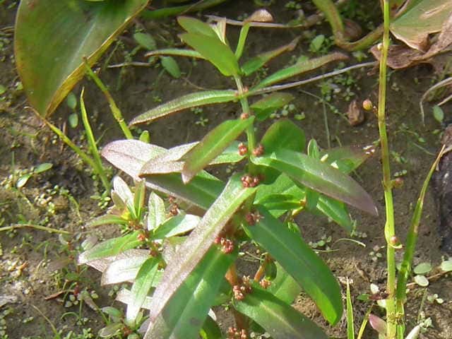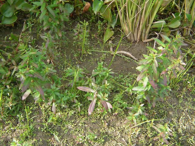 1年草 本州〜琉球の水田や湿地に生える。茎は直立し、毛はなくて、4稜があり、枝を分け、高さ10〜30cmになる。葉は対生し、ほとんど柄がなく、広線形〜披針状長楕円形、先は鋭形、基部はやや耳状となって茎を抱き、長さ1.8〜5cm、幅2〜12mm。花は集散花序をなし、腋生する。花径は約1.5mm。萼筒は鐘形、長さ約1.5mm、4裂片は三角形。花弁は小さく4個で、倒卵形、淡紫色。雄しべは4個。さく果は球形、径約2mm、紅紫色で、萼より長い。種子は細かく、三角形。花期は9〜11月。(日本の野生植物) 学名は、Ammannia multiflora ミソハギ科ヒメミソハギ属 |