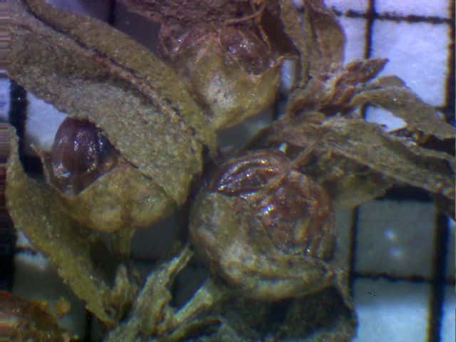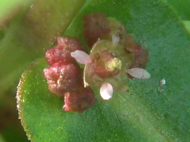 | ▼果実は直径約1.5mm。 | ▼下半部は萼に包まれる。 | ▼中央の胎座を囲んで種子が並ぶ。 |