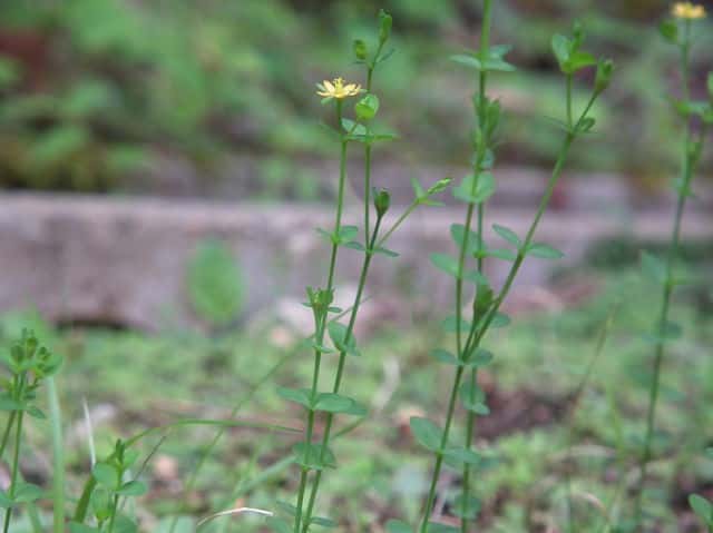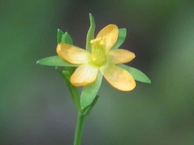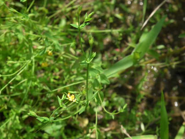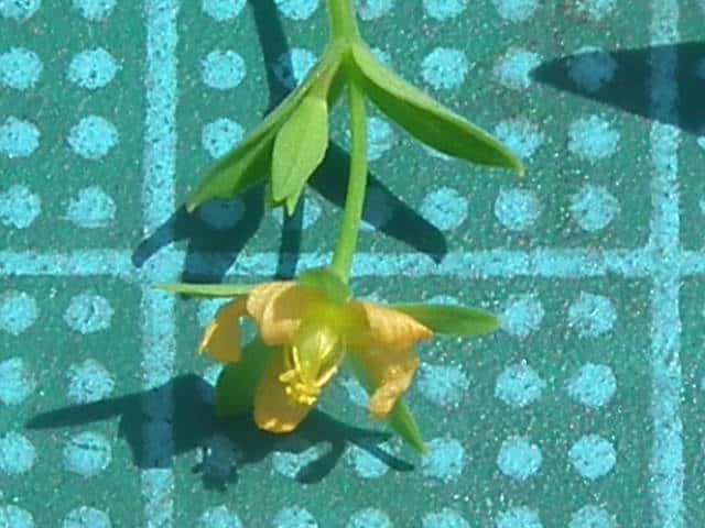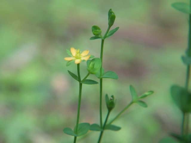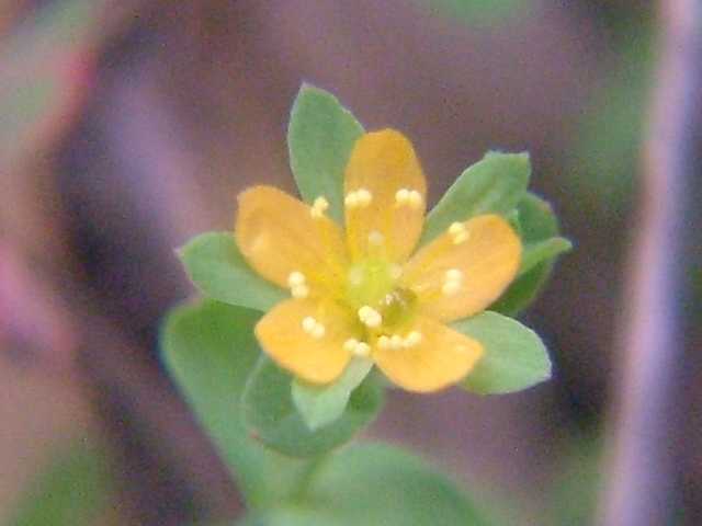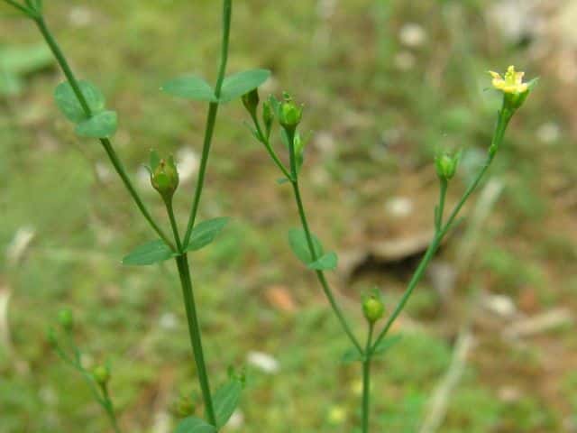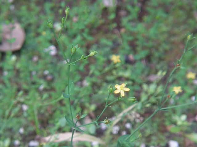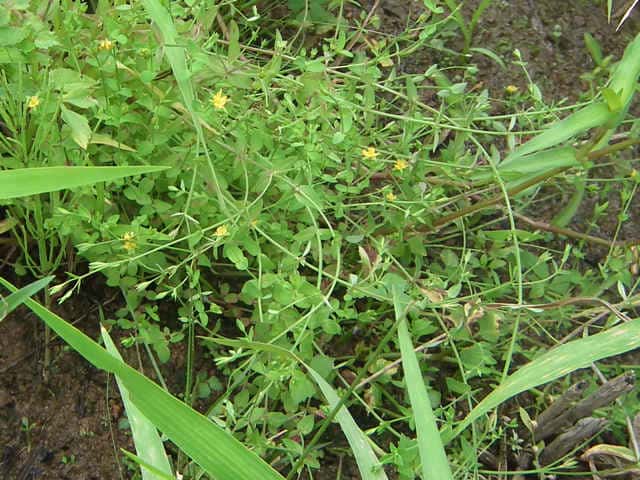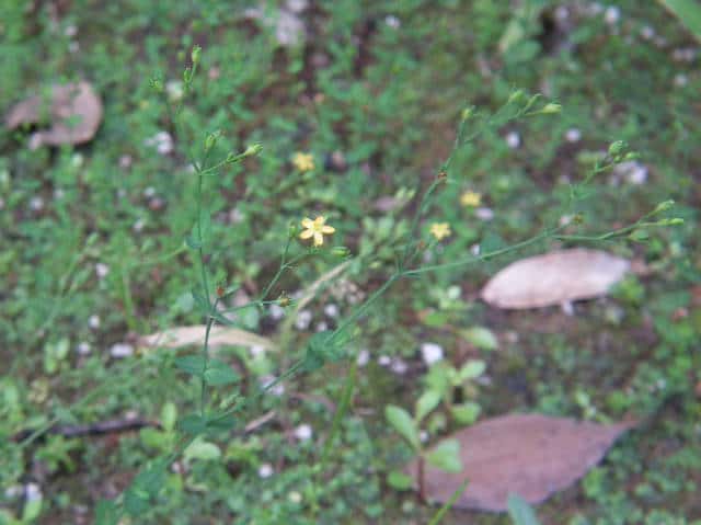 | 1年草ときに多年草 日本全土の水田のあぜや休耕田、野原の湿地などに生える。高さ(2〜)15〜40cm。茎は4稜があり、細いが丈夫で、直立〜斜上するかまたは倒伏、分枝し、枝は鋭角的に斜上する。節間は長さ2〜50mm、葉よりも長い。葉は青みをおびた緑色で、質が薄く、斜上し、広卵状三角形〜卵形〜楕円形〜披針形、長さ2〜18mm、幅1〜10mm、鈍頭〜円頭、基部は円形でなかば茎を抱くかまれに基部は細くなる。葉身の内側に多数の小さな明点があり、辺縁に腺体はない。花は1〜30花が集散状につき、径6〜8mm、黄色で赤みをおびることなく、花柄は長さ2〜30mm、花よりはるかに長い。苞は披針形または線状披針形。萼片は5個、やや等長あるいは不等長、狭楕円形〜倒卵形、長さ2〜2.5mm、幅0.5〜2mm、鋭頭、全縁、明線がある。花弁は5個、倒卵形〜楕円形、長さ1.7〜5mm、幅0.8〜1.3mm、鈍頭、腺体はない。雄しべは5〜30個、散在するかあるいはゆるやかに5束にまとまり、長さ1.5〜2.8mm、葯に明点がある。花柱は2あるいは3個、長さ0.4〜1.2mm、子房の0.4〜0.8(〜1)倍長。さく果は球状〜円筒状、長さ(2〜)2.5〜6mm、果皮に腺体がない。種子は淡紫褐色、長さ約0.5mm。花期は7〜8月。(日本の野生植物) 学名は、Hypericum japonicum オトギリソウ科オトギリソウ属 よく似たコケオトギリは雄しべが5〜20個、苞が葉状で楕円形。 |