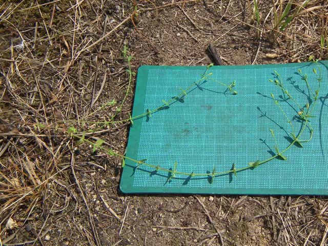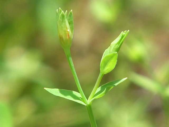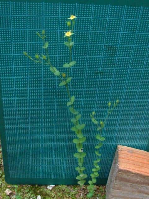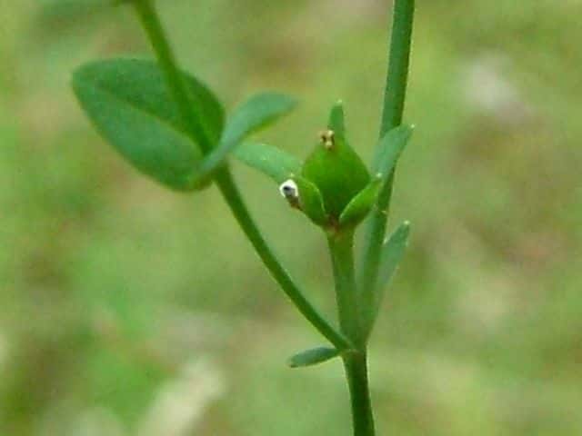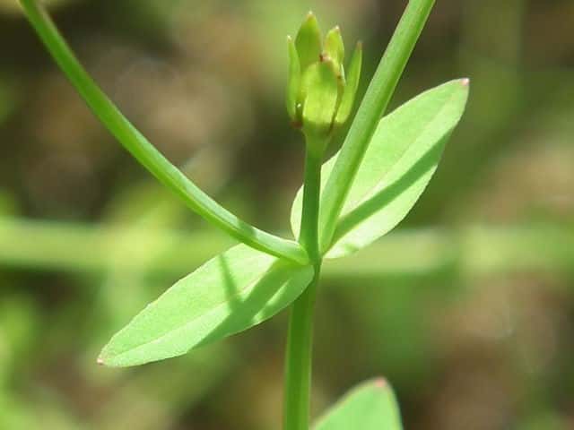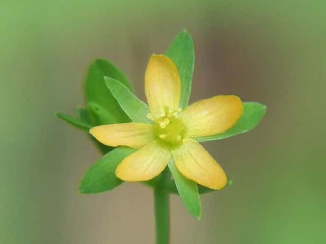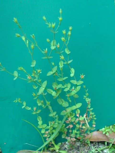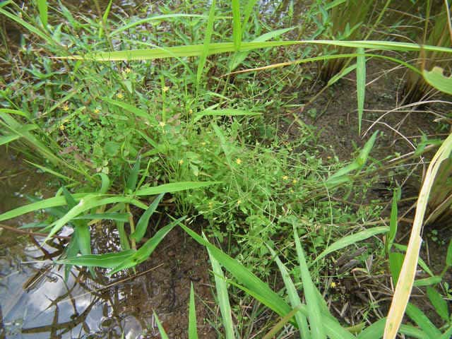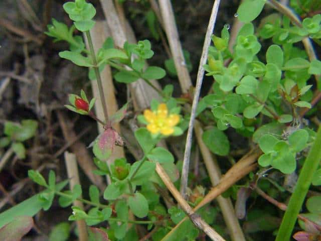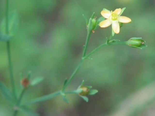 | 1年草ときに多年草 日本全土の水田のあぜや休耕田、野原の湿地などに生える。高さ(2〜)15〜40cm。茎は4稜があり、細いが丈夫で、直立〜斜上するかまたは倒伏、分枝し、枝は鋭角的に斜上する。節間は長さ2〜50mm、葉よりも長い。葉は青みをおびた緑色で、質が薄く、斜上し、広卵状三角形〜卵形〜楕円形〜披針形、長さ2〜18mm、幅1〜10mm、鈍頭〜円頭、基部は円形でなかば茎を抱くかまれに基部は細くなる。葉身の内側に多数の小さな明点があり、辺縁に腺体はない。花は1〜30花が集散状につき、径6〜8mm、黄色で赤みをおびることなく、花柄は長さ2〜30mm、花よりはるかに長い。苞は披針形または線状披針形。萼片は5個、やや等長あるいは不等長、狭楕円形〜倒卵形、長さ2〜2.5mm、幅0.5〜2mm、鋭頭、全縁、明線がある。花弁は5個、倒卵形〜楕円形、長さ1.7〜5mm、幅0.8〜1.3mm、鈍頭、腺体はない。雄しべは5〜30個、散在するかあるいはゆるやかに5束にまとまり、長さ1.5〜2.8mm、葯に明点がある。花柱は2あるいは3個、長さ0.4〜1.2mm、子房の0.4〜0.8(〜1)倍長。さく果は球状〜円筒状、長さ(2〜)2.5〜6mm、果皮に腺体がない。種子は淡紫褐色、長さ約0.5mm。花期は7〜8月。(日本の野生植物) 学名は、Hypericum japonicum オトギリソウ科オトギリソウ属 よく似たコケオトギリは雄しべが5〜20個、苞が葉状で楕円形。 |