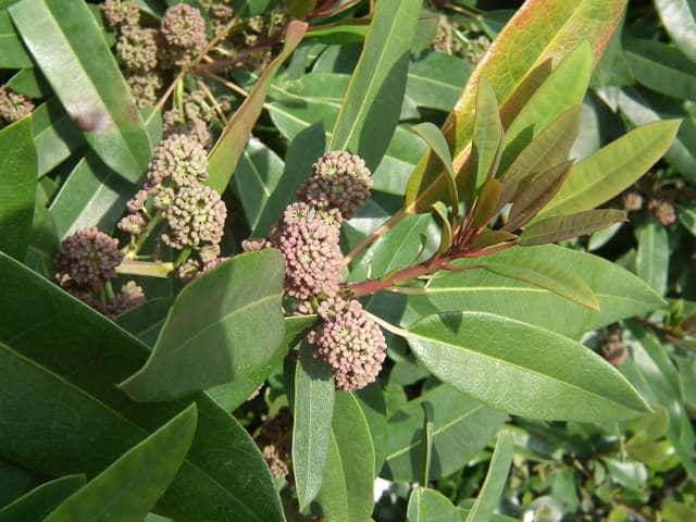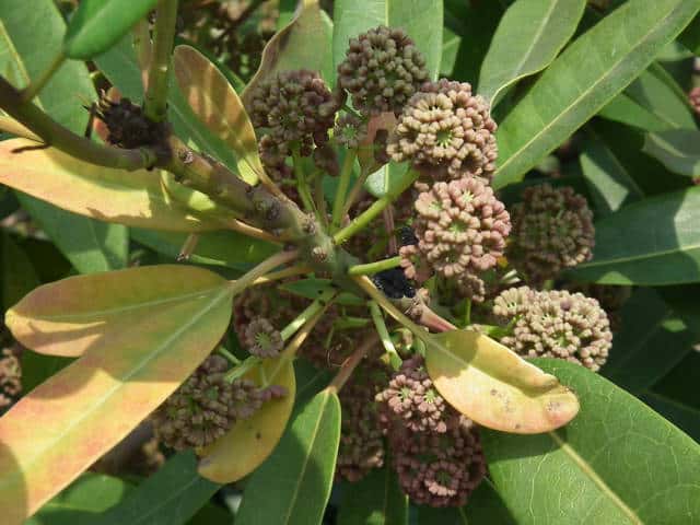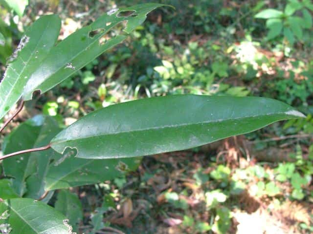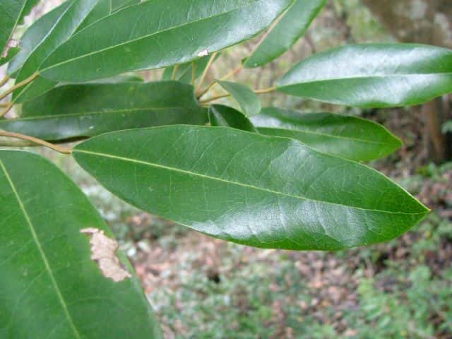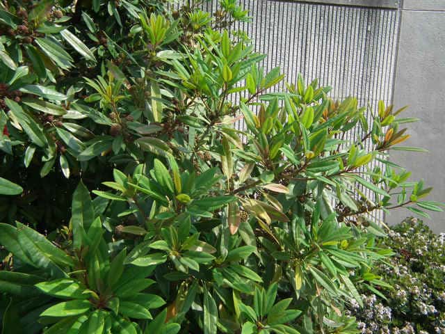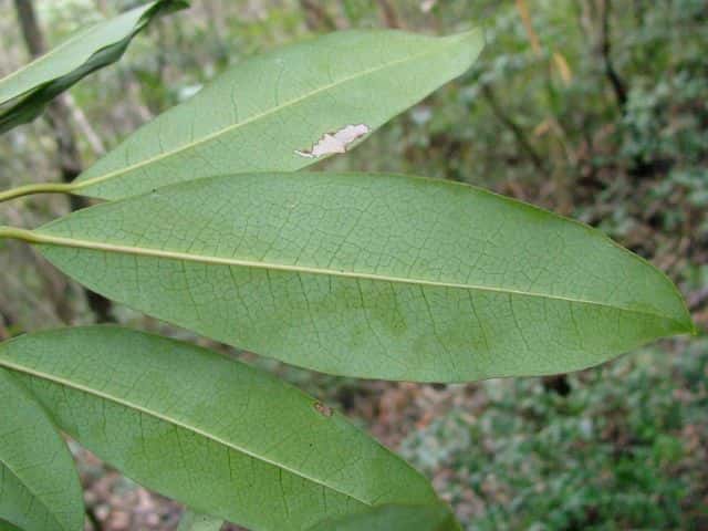 | 常緑高木 東北地方南部以西〜沖縄の照葉樹林内に生える。高さ10mほどになる。樹皮は灰褐色で皮目が散生する。若い枝は緑色。古い枝は葉痕が目立つ。葉は互生。枝先にかたまってつく。葉身は長さ4〜15cm、幅2〜6cmの挟楕円形〜倒披針形。ふちは全縁。側脈は8〜10対あり、網状脈がはっきりしている。革質で表面は光沢があり、両面とも無毛。葉柄は長さ1.5〜5cm、ふつう緑色まれに紅色を帯びる。雌雄別株。前年枝の葉腋から長さ1.5〜6cmの総状花序を出す。花は花序枝の上部にかたまってつく傾向がある。雄花は長さ3mmほどの柄があり、花弁はなく、小さな萼片3〜6個と雄しべが4〜12個ある。雌花には長さ約0.5mmの小さな萼片が3〜6個ある。子房は狭卵形で長さ1〜1.5mm。柱頭は3〜4個、淡黄色で外側にそり返る。果実は核果。長さ8〜9mmの楕円形で、12〜1月に藍黒色に熟す。表面は粉をふく。花序は垂れ下がらない。核は直径6〜7mm。花期は5〜6月。 冬芽の頂芽は狭卵形で葉柄が変化した多数の芽鱗につつまれる。葉痕は大形で、維管束痕は3個。葉腋には小さな花芽がつく。(樹に咲く花) 学名は、Daphniphylum teijismannii ユズリハ科ユズリハ属 ユズリハは葉が8〜20cmと大きく、10〜19対の側脈が目立つ。 |