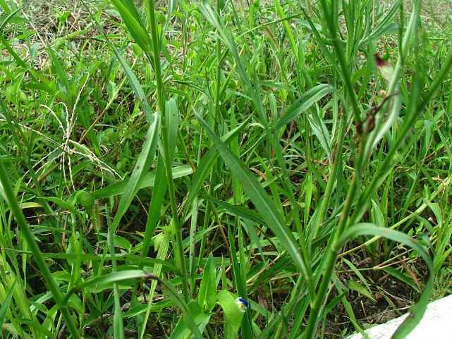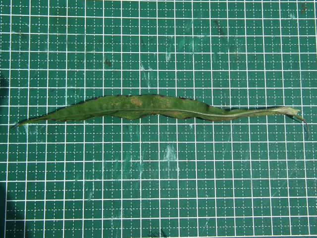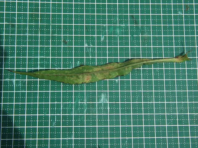 | ▼葉は中央部が広くなる。 | ▼葉は長さ約16cm、幅約1.5cm。 | ▼葉の裏面。 |