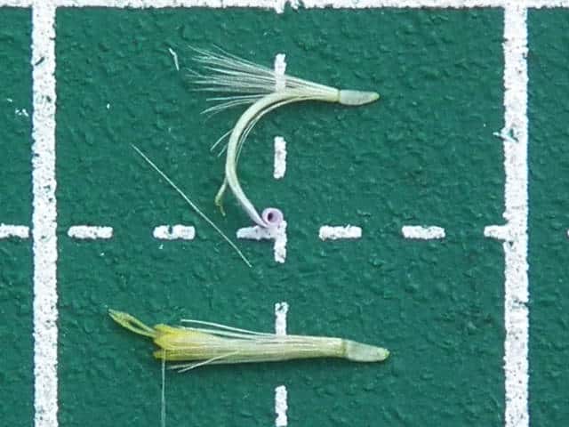 | ▼舌状花(上)と筒状花(下)。 | ▼冠毛は筒状花より短い。筒状花は子房を含め長さ約5mm。 | |