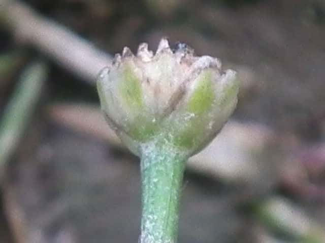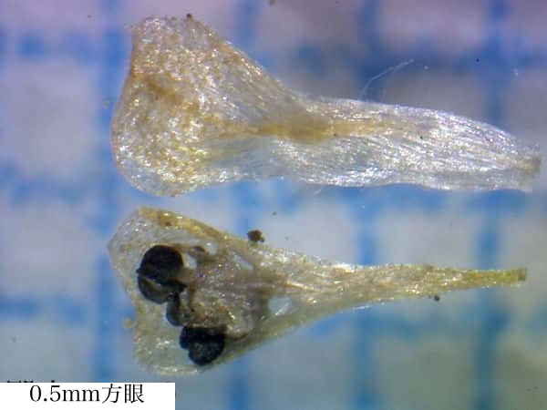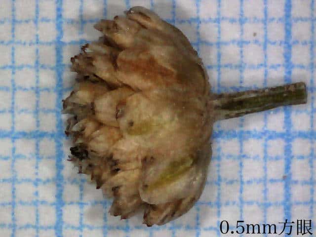 | ▼頭花は直径約4.5mm。 | ▼花苞(上)と雌花。 | ▼花苞(下)と花弁(3個)、萼(右)。 |