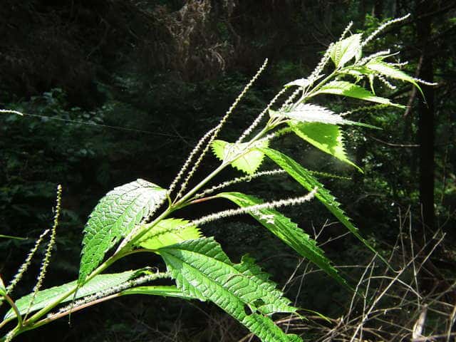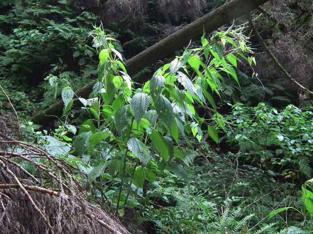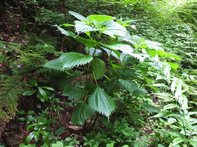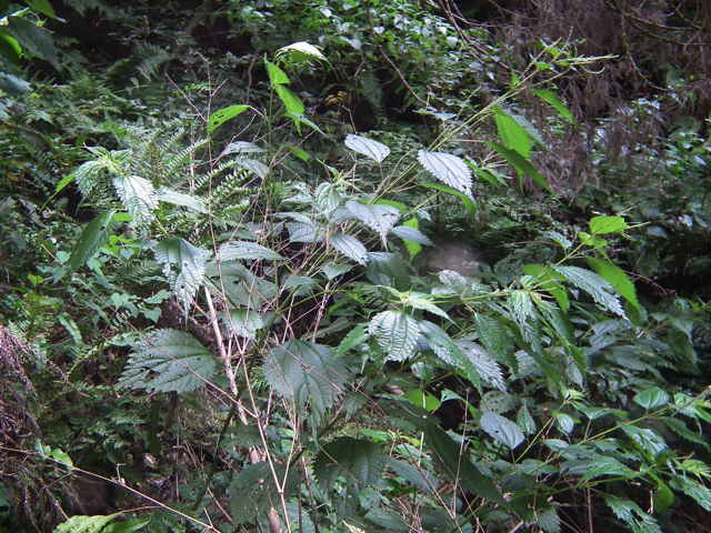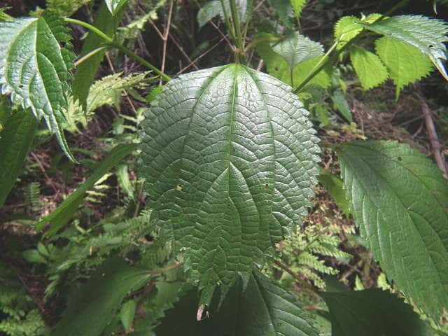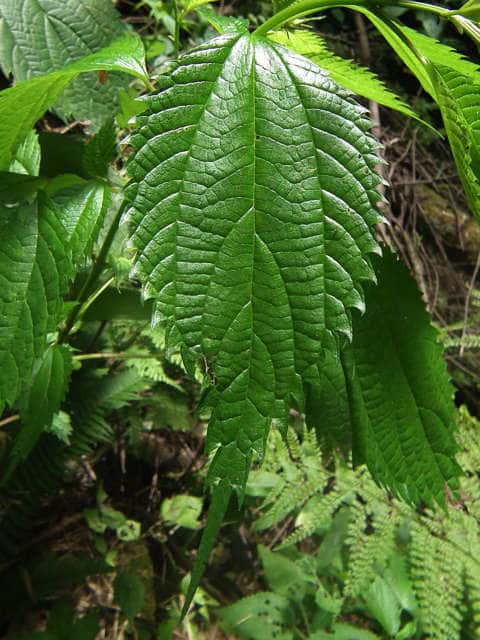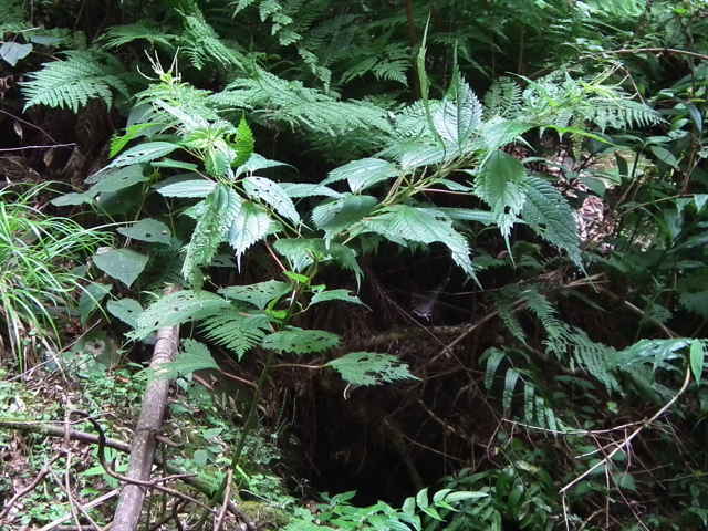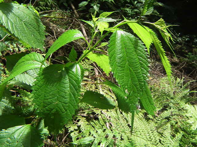 | 多年草 ナガバヤブマオは葉が卵状長楕円形で発育のいいものでも長さ25cm×幅13cmであるが、葉の幅が広く円形に近いものがある。詳細は不明。参考: 隠岐の植物 学名は、Boehmeria sieboldiana var. ovata イラクサ科ヤブマオ属 |