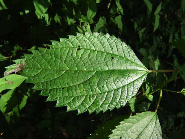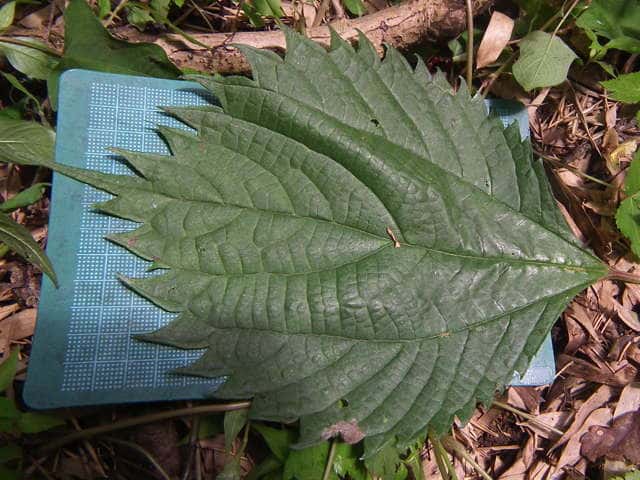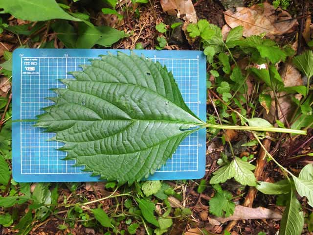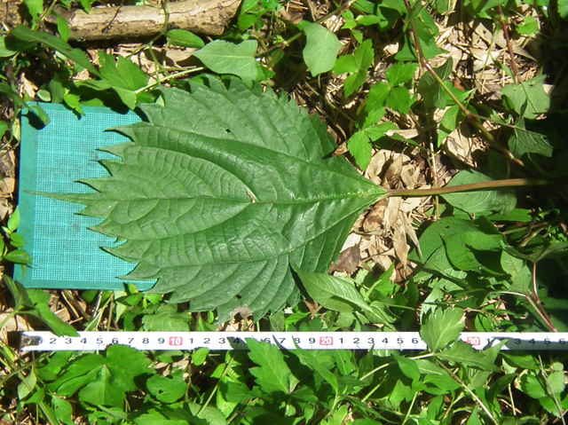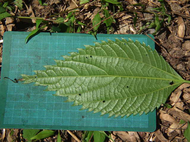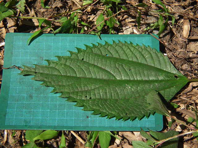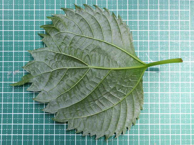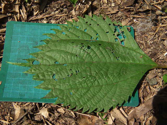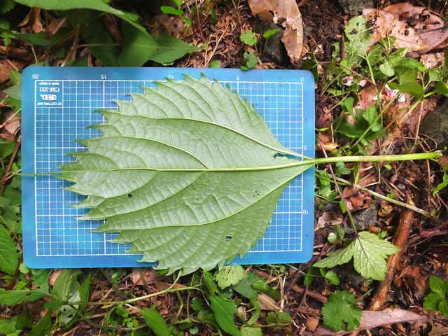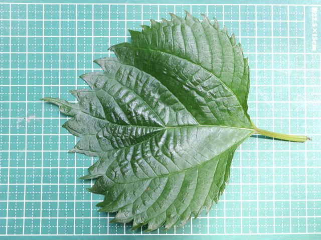 | ▼中部の葉。 | ▼葉身は約23cm×11cm、葉柄は7cm。 | ▼片側20個の鋭い鋸歯がある。 |