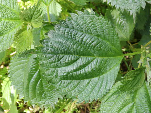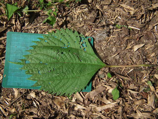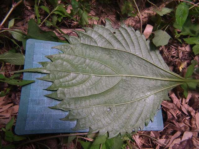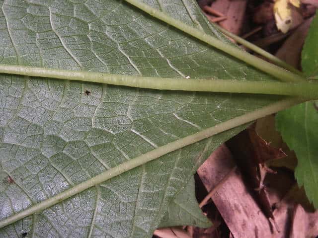 | ▼下部の大きな葉。 | ▼葉身は25×17cm。片側17個の鋸歯がある。 | ▼表面はほぼ無毛。 |