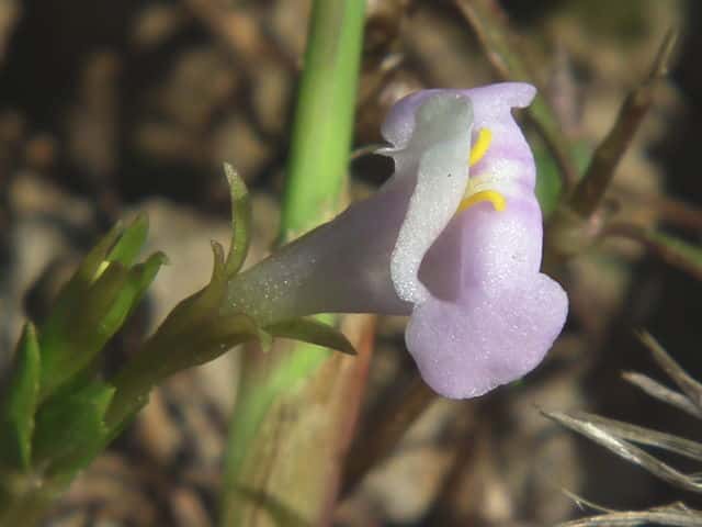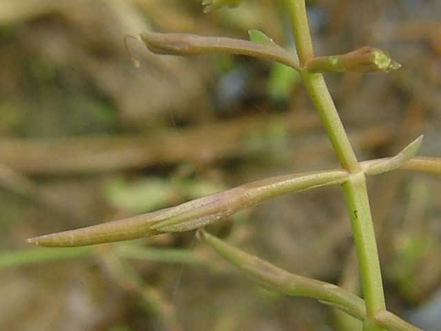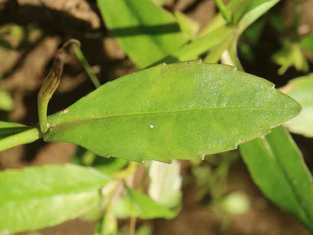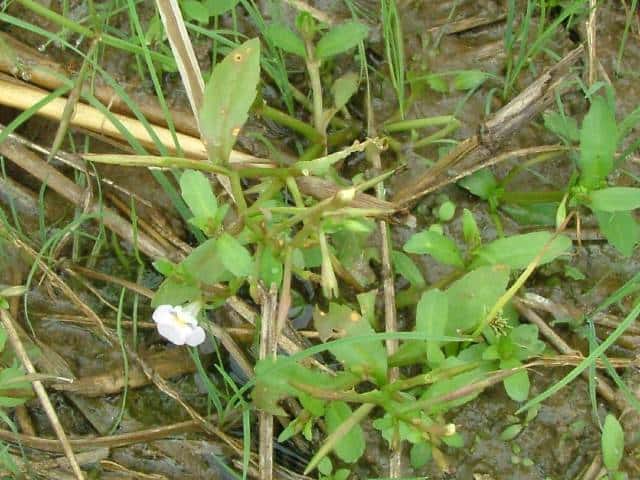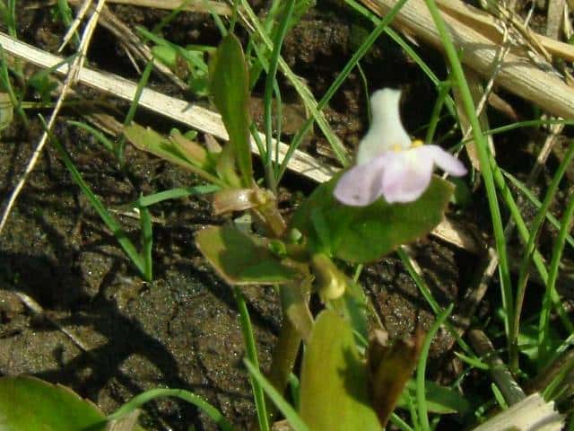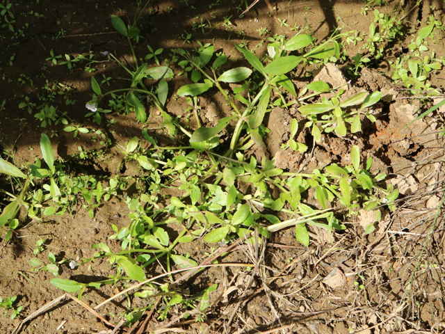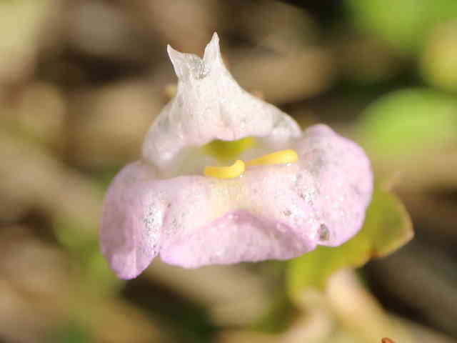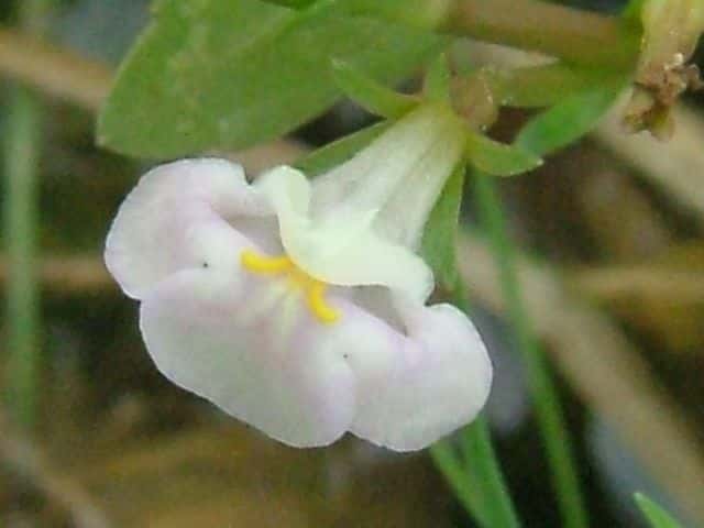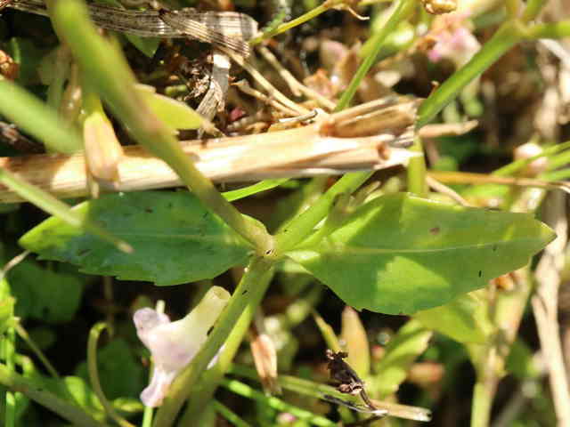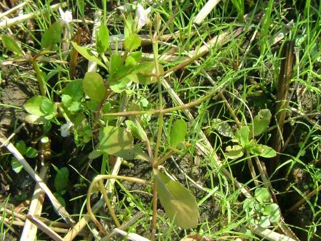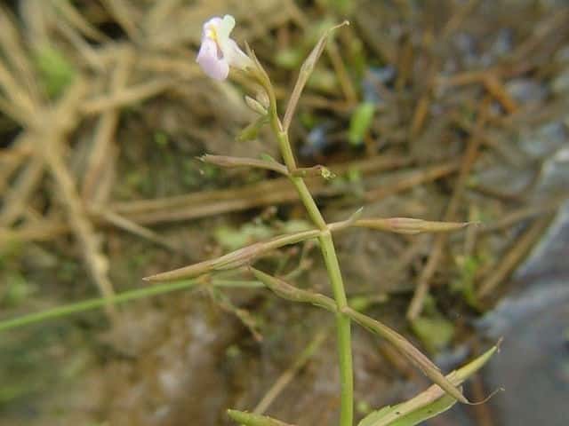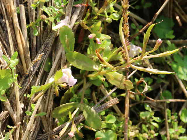 | 1年草 福島県〜九州の水田のあぜや、湿地などに生える。茎は分枝して株になる。草丈は10〜20cm程度で、葉は対生し葉柄がなく、倒披針形で先は丸く、縁には5〜8個のとがった鋸歯がある。茎の先に淡紅色の花を咲かせ、花の3裂する下唇のまん中の裂片が下に長くない。花は上下からつぶしたような形が特徴。花柄や果柄は披針形の苞葉より長く開出する。果実はさく果、細長い円柱状、長さ1〜1.5cm。 花期は8〜10月。 学名は、Bonnaya antipoda var. verbenifolia アゼナ科スズメノトウガラシ属 最近、スズメノトウガラシはヒロハスズメノトウガラシとエダウチスズメノトウガラシに分けられる。 ・エダウチスズメノトウガラシ 葉が狭く、元が狭まる。花の3裂する下唇のまん中の裂片が長くなる。葉の先のほうが一番広い。先端が鋭く尖る。中脈を境にやや二つ折れになる。花柄、果柄は葉の様な苞葉より短い。学名 Bonnaya antipoda var. grandiflora よく似たアゼトウガラシは葉の切れ込みが浅く、先が丸まっている。 |