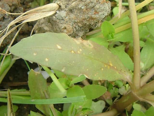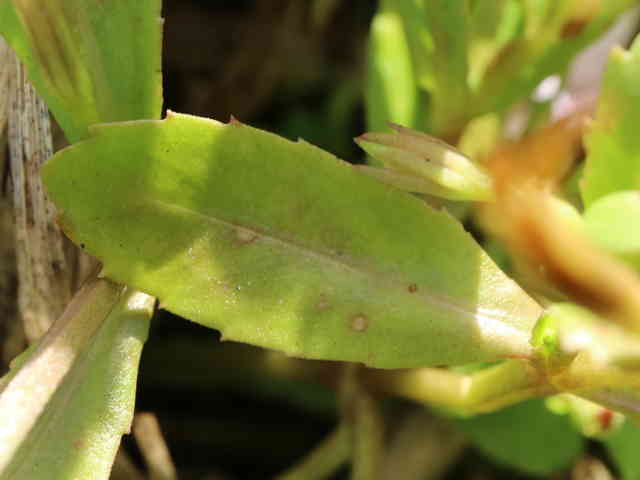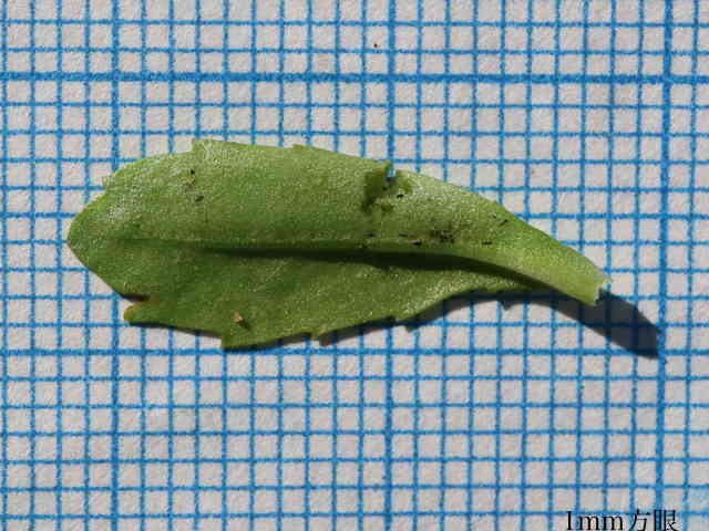 | ▼表面には網目状の模様がある。 | ▼葉は先端が丸く、尖った小さな鋸歯がある。 | ▼葉は長さ約4cm。 |