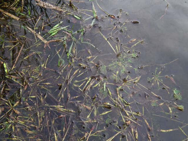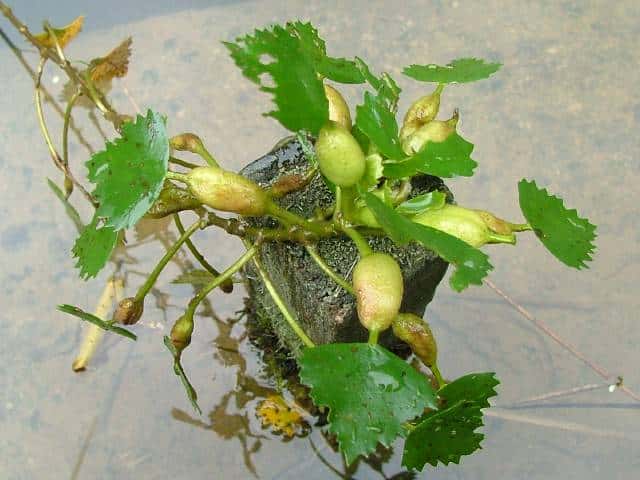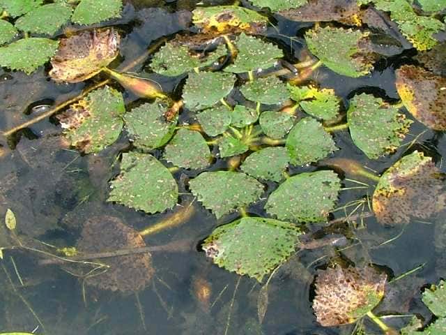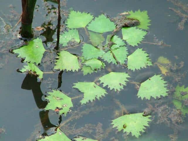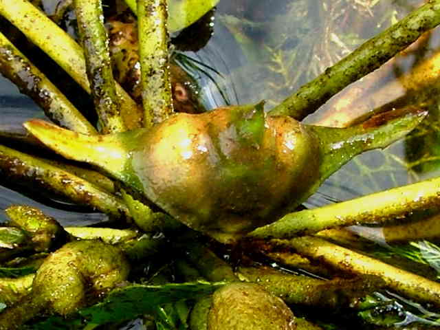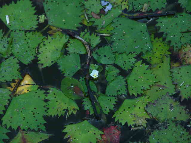 | 1年草 北海道〜九州の湖沼やため池、河川、水路の淀みなどに生育する浮葉植物。中〜富栄養水域に生育し、最近は富栄養化の進行した水域で異常繁殖する例も見られる。茎は盛んに分枝して伸長し、水面に浮葉を展開する。浮葉はロゼット状に配列し、葉身は卵状菱形または円みのある三角形で長さ2〜5cm、幅2〜8cm、鋸歯がある。葉柄の中央部は膨れて浮嚢となる。各ロゼットに1日に1(〜2)個の花が咲く。花弁は白色で4枚、直径1〜1.5cm。雄しべ4、雌しべ1。果実は4個の萼片のうちの2つが発達して刺になる。全幅3〜5cm、中央の子房突起が突出する。脱落した他の2個の萼片の跡が突起状になることがある。この突起(擬角)の著しいものをイボビシと呼ぶこともあるが、これはヒシの種内変異である。また明らかな4刺を示すものをコオニビシと呼ぶ。遺伝的にはヒシの一型であることが明らかにされているが、しばしば独立した集団を形成するので、区別する場合の学名はT. japonica var. pumilaという新組み合わせになる。花期は7〜9月。(日本の水草) 学名は、Trapa japonica ミソハギ科ヒシ属 ヒシより全体に小形で、果実の刺が4個あるものをヒメビシという。またオニビシは果実が大形で、4本の刺(2本の上刺と2本の下刺)を持ち、全幅45〜75mm、子房突起が突出せず、果実の肩とほぼ同じ高さとなる。 |