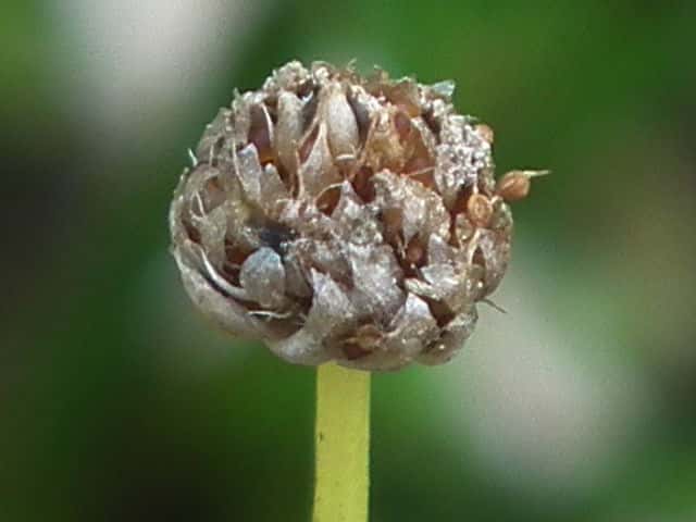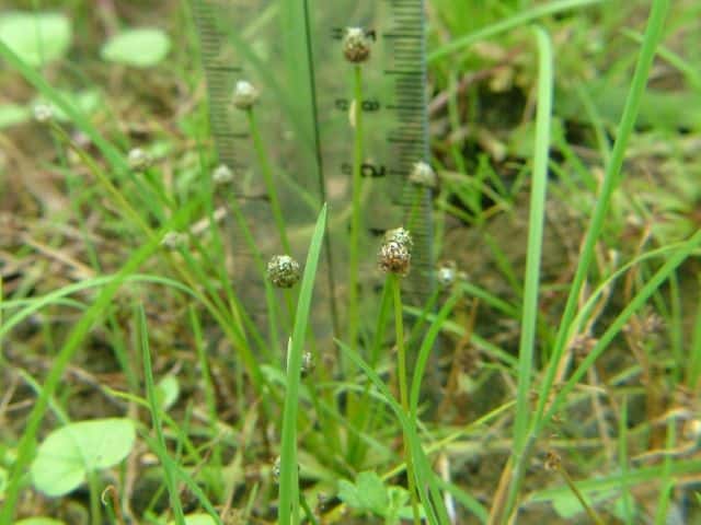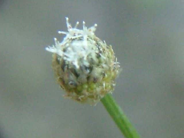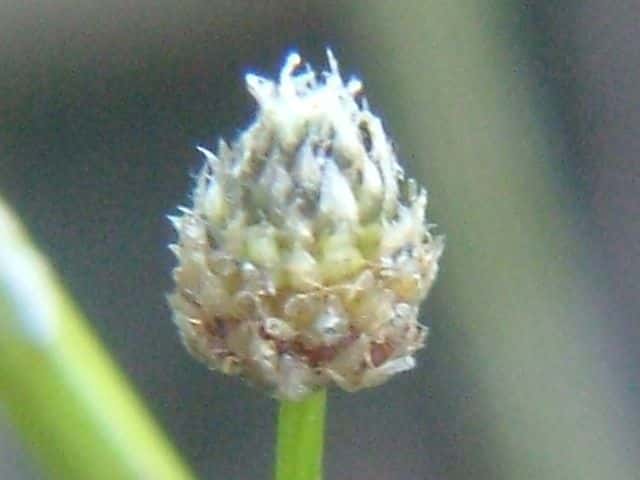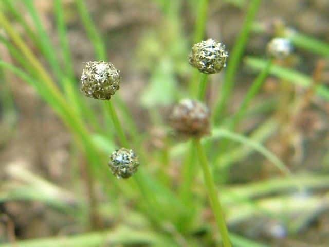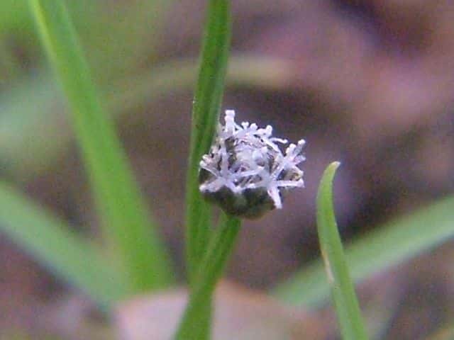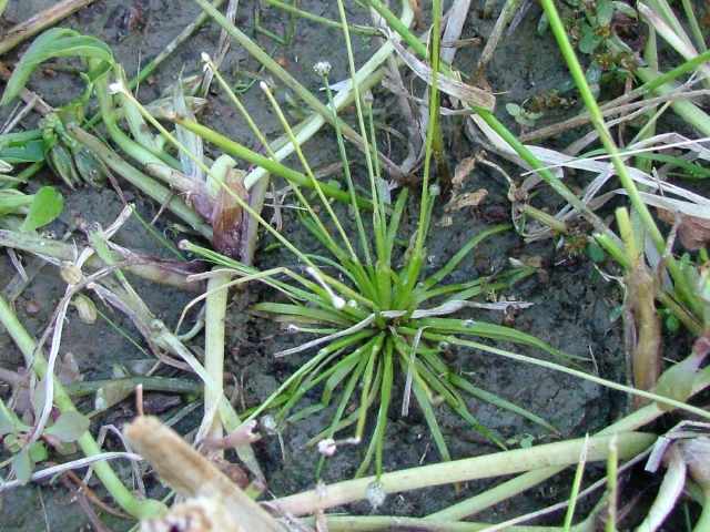 1年草 本州〜沖縄の水田や水湿地に生える。根はひげ状で白色。葉は根生して斜上し、狭線形、長さ2〜8cm、幅1〜2mm、先は次第に細くなって鋭尖頭、無毛。花茎は高さ5〜15(20)cm、鞘は1.5〜3cm。頭花は卵球形、灰褐色〜汚白色で直径4mm内外、総苞片は楕円形、膜質、鈍頭、長さ約1.5mmで目立たない。花苞は卵状長楕円形、やや鋭頭、長さ1.5〜2mm。花床はまばらに毛があるかまたはやや無毛。雄花は少数、萼片は合生して下半部は筒状、上半部は前方が開き、先は3裂、背面に毛を散生、花弁は筒状に合生し先は3裂、上縁に2細胞からなる毛があり、内に黒腺がある。雄ずいは6個、葯は白色。雌花は多数、萼片は2,線形で離生し長さ約1mm、花弁はない。種子は楕円形、黄褐色、長さ0.4mm、不規則な6角状網目がある。花期は8〜10月。(原色日本植物図鑑) 学名は、Eriocaulon cinereum ホシクサ科ホシクサ属 |