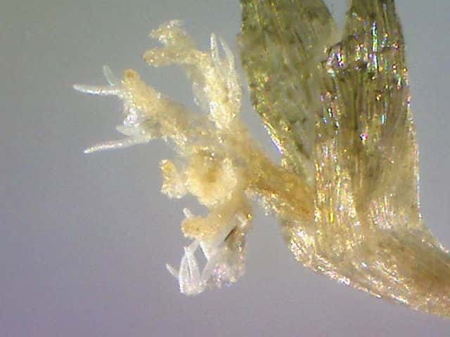 | ▼萼の背面、先端は3裂する。 | ▼萼の中に雄花がある。 | ▼花弁は3裂し、先に棍棒状の毛がある。 |