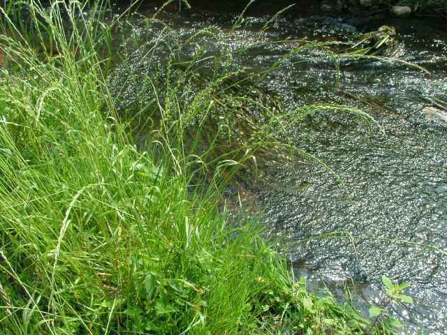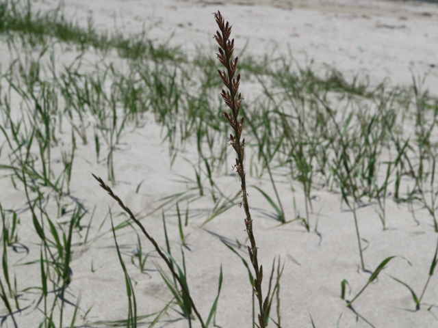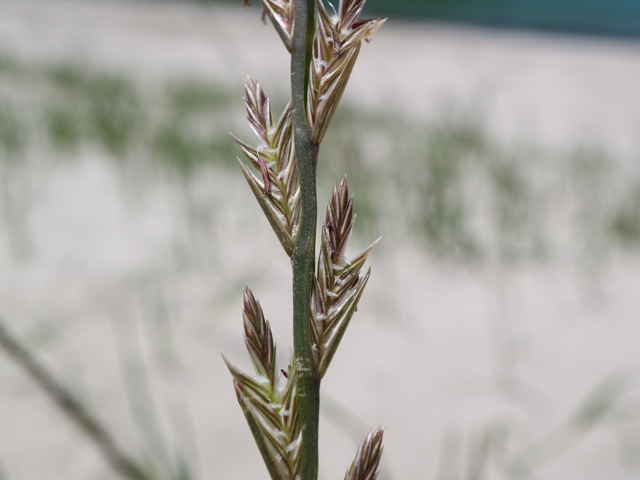 | 多年草 ヨーロッパ原産で、牧草として栽培されているが、北海道〜九州の路傍や休閑地に逸脱している。茎は高さ30〜60cm、全体平滑・無毛。葉は長さ10〜20cm、幅1.5〜3mm、多くは根生する。葉舌は長さ2mm、葉鞘の上端に狭い葉耳がつく。花序は穂状、長さ10〜20cm。小穂は偏平、無梗、長さ8〜15mm、4〜10小花よりなる。小花は無芒。花軸の側面の小穂は第1苞穎がなく、第2苞穎は長さ8〜9mm。小花は6〜7mm、護穎と内穎はほぼ等長。頂生の小穂は2個の包穎をもつ。果実は長さ3.8から4mm、茶褐色、無光沢。ネズミムギに酷似するがホソムギの小花には芒がない。花期は5〜6月。(日本イネ科植物図譜) 学名は、Lolium perenne イネ科ネズミムギ属 ホソムギとネズミムギの雑種にネズミホソムギがある。 |