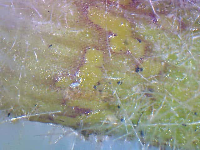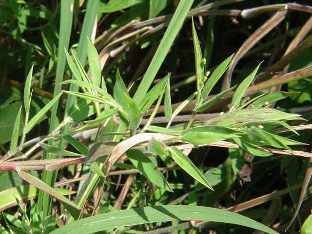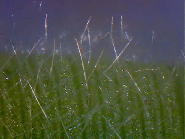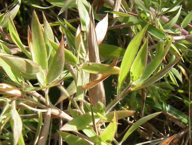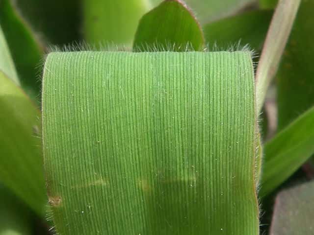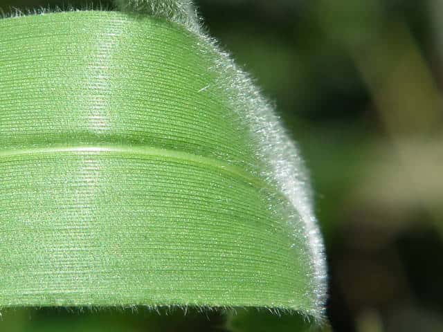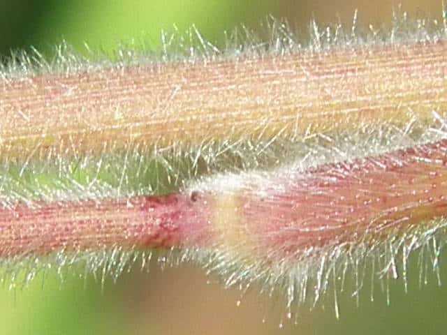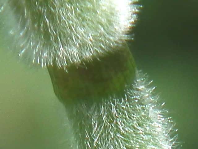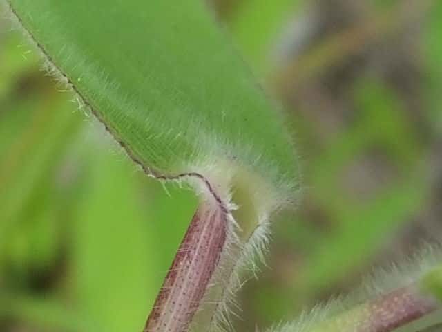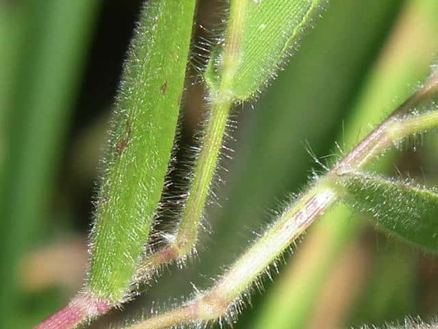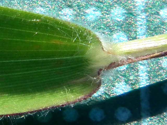 | ▼葉の裏面の毛。 | ▼葉舌は短く毛が密生する。 | ▼節の下に腺があり毛がない。 |