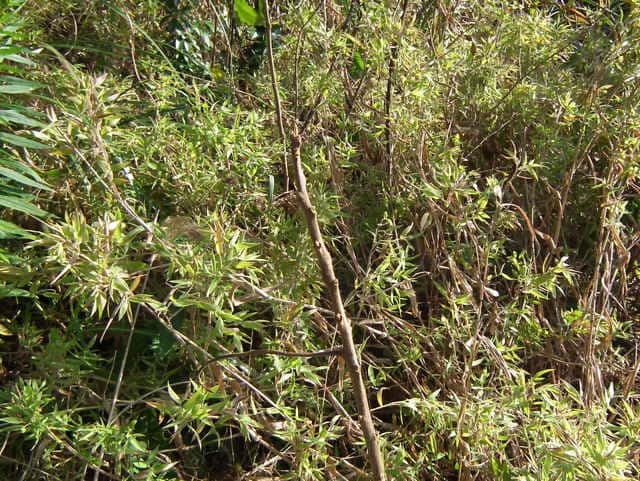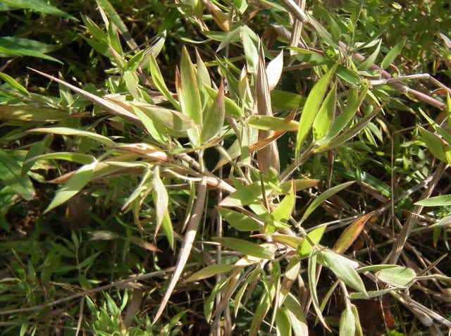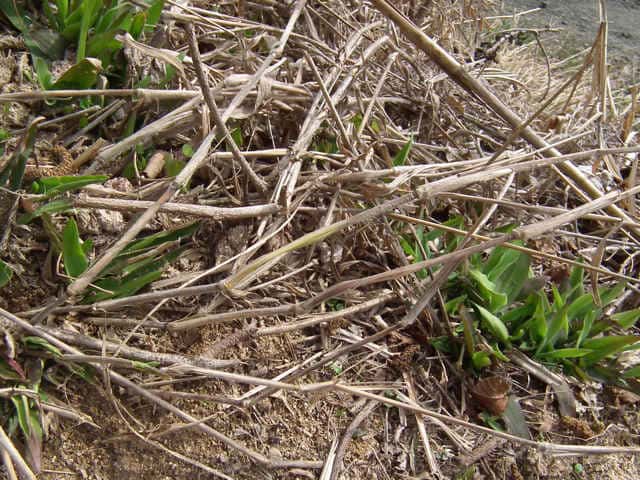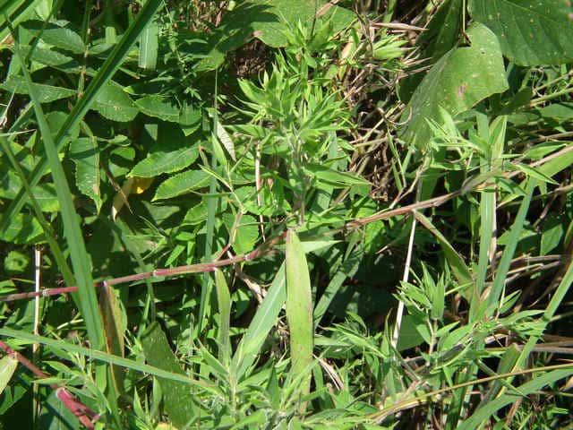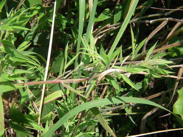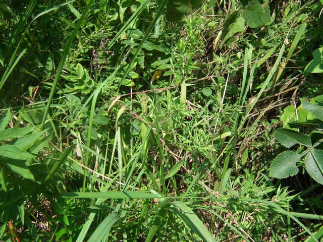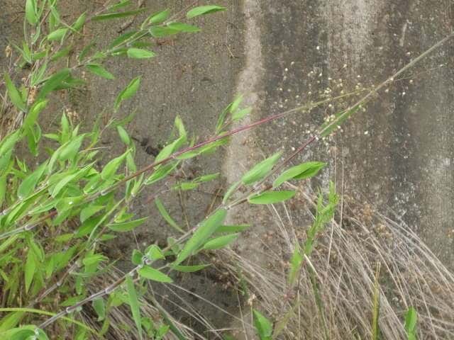 多年草 北アメリカ原産。1977年頃に京都府宮津市で見いだされた。道路工事で吹きつけた牧草に混じっていたとされる。全体に開出する毛を布く。稈は直立して上部で分岐し、高さ1.2mほどになる。葉身は広線形、葉鞘は節間より短い。長さ15cmほどの細かく分岐した円錐形の穂を出し、長さ2.4mmほどの小穂をややまばらにつける。小穂にも毛がある。花期は夏。(日本帰化植物写真図鑑) 学名は、Dichanthelium scoparium イネ科ケヌカキビ属 よく似ているとされるニコゲヌカキビは、高さ20〜70cmと小型で、小穂が長さ1.5〜1.7mmと小さい。 名前はまだ不明だがホウキヌカキビに似たものが林道に生えている。 |