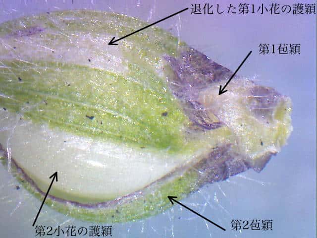 | ▼穎を除くと第2小花がある。 | ▼第2小花の護穎と内穎。 | |
