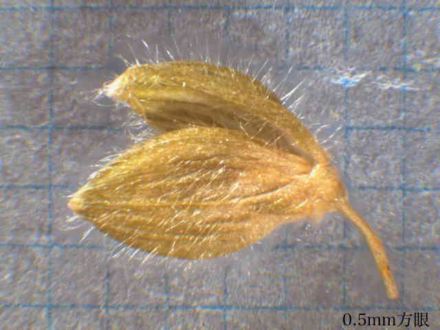 | ▼第1苞穎は1mm程度。 | ▼小穂は長毛が多く、長さ約2.3mm。 | |