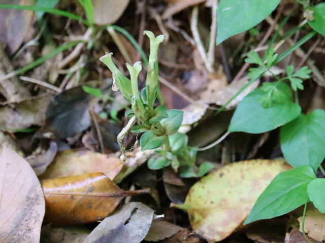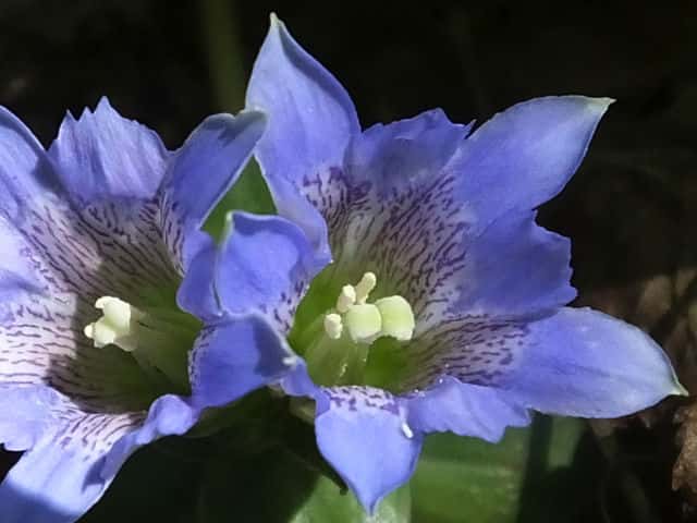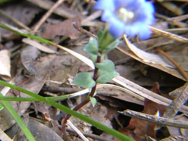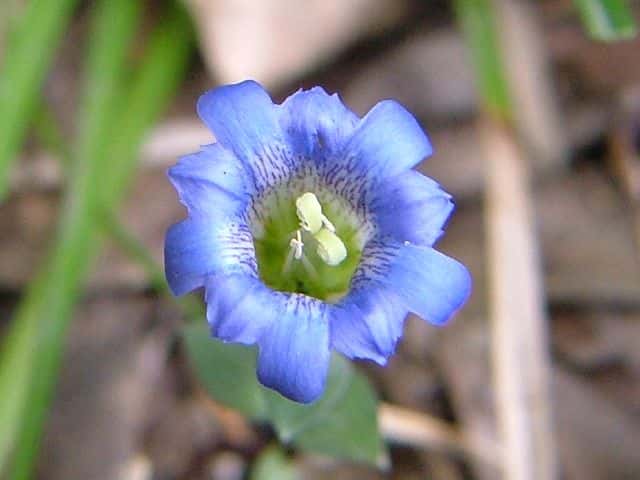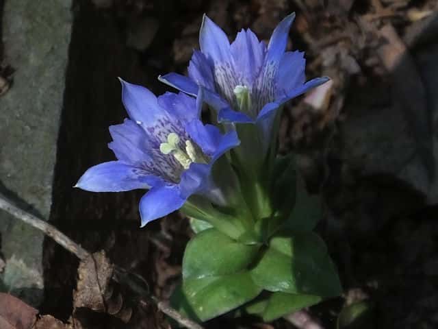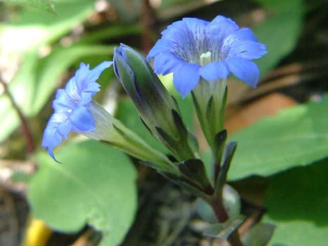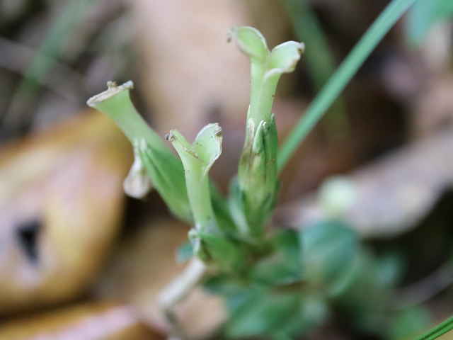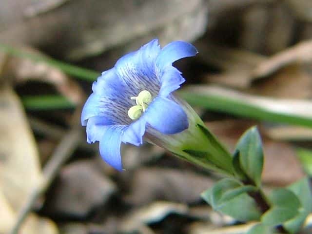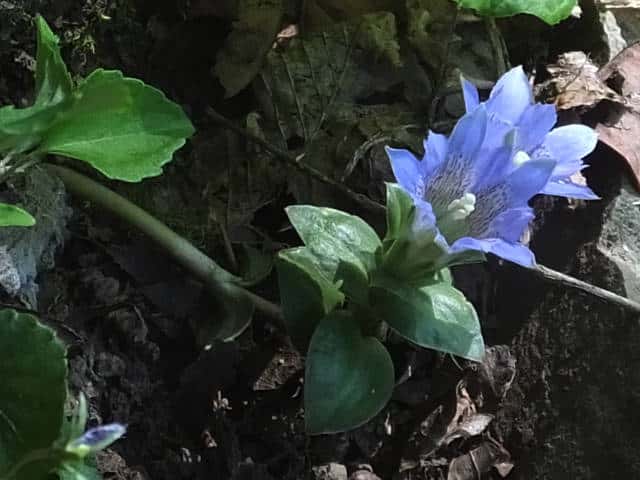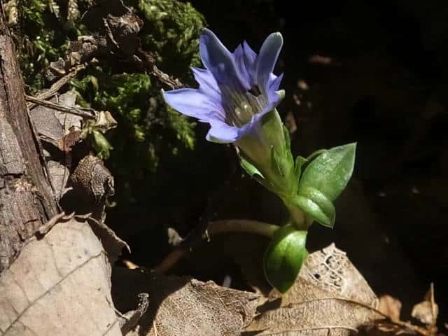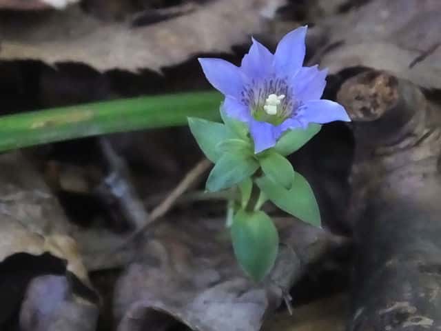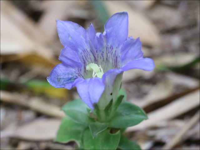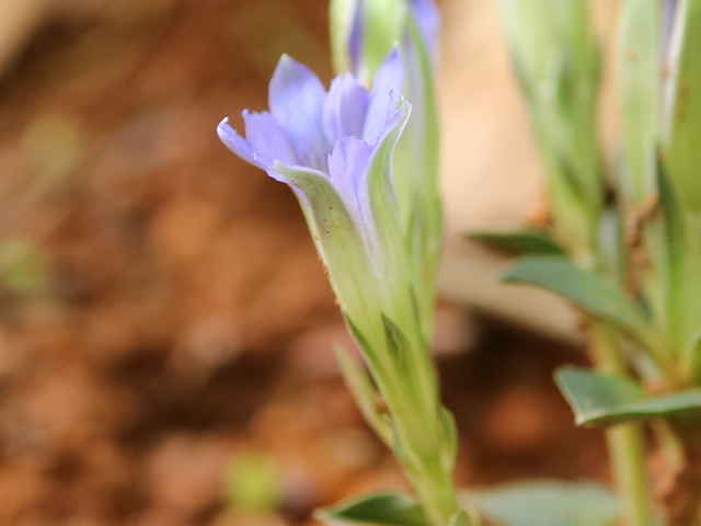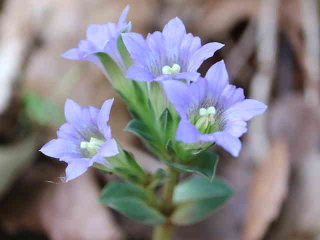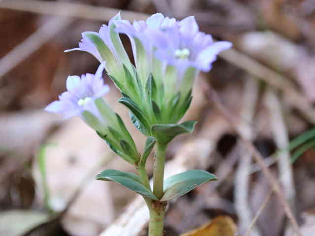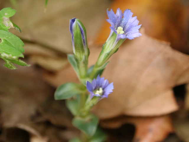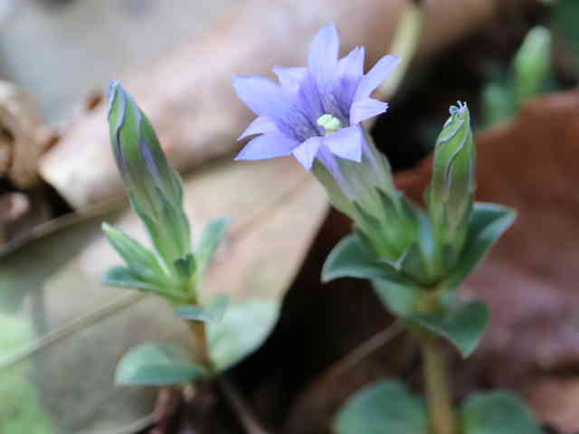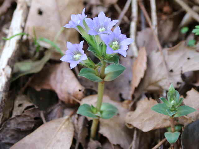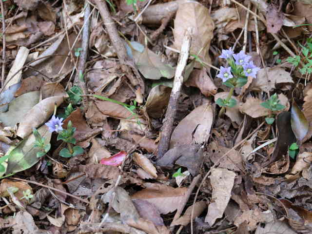 | 越年草 北海道〜九州の山野の日当りのよいところに生える。茎は高さ6〜9cmになり、上半部に葉が密に対生する。葉は長さ0.5〜1.2cmの広卵形でやや厚く、裏面はしばしば紫色を帯びる。茎の先に青紫色の花が数個集まってつく。花冠は長さ2〜2.5cmの鐘形。萼は緑色。花期は3〜5月。(野に咲く花) 学名は、Gentiana zollingeri リンドウ科リンドウ属 |
