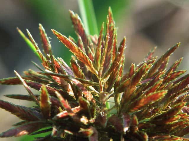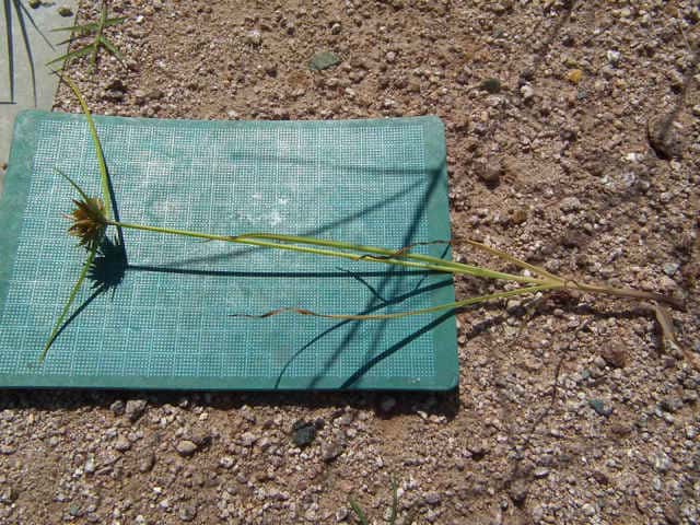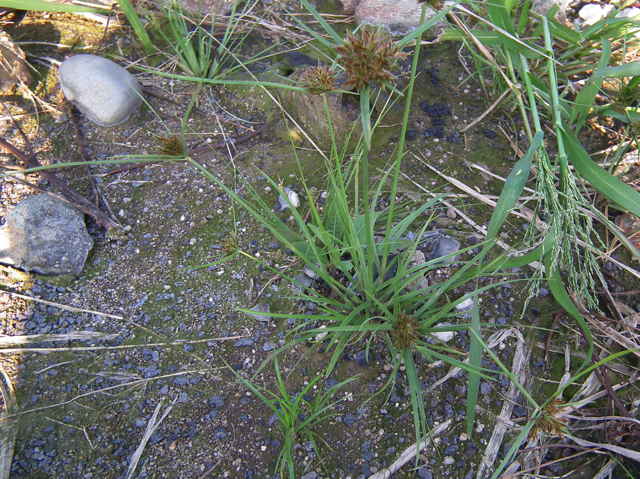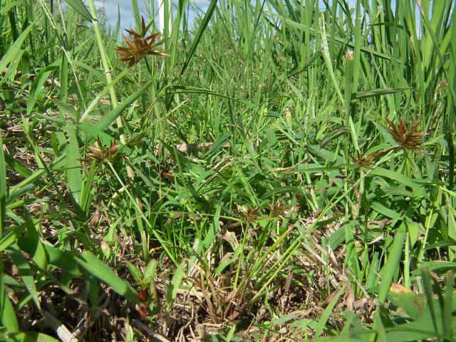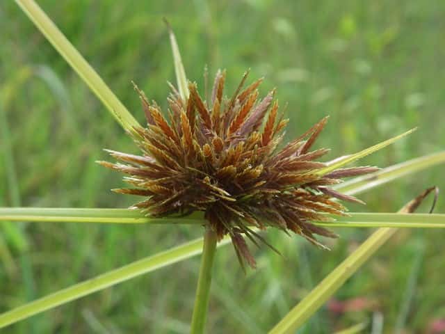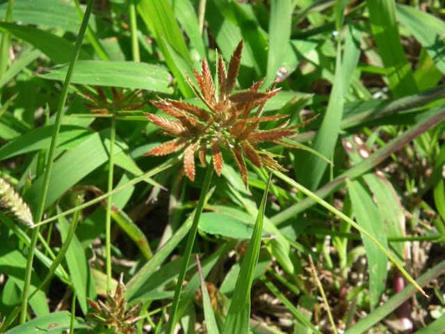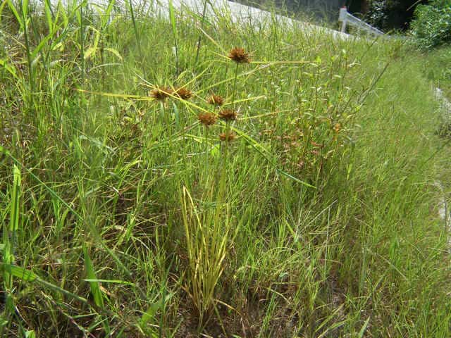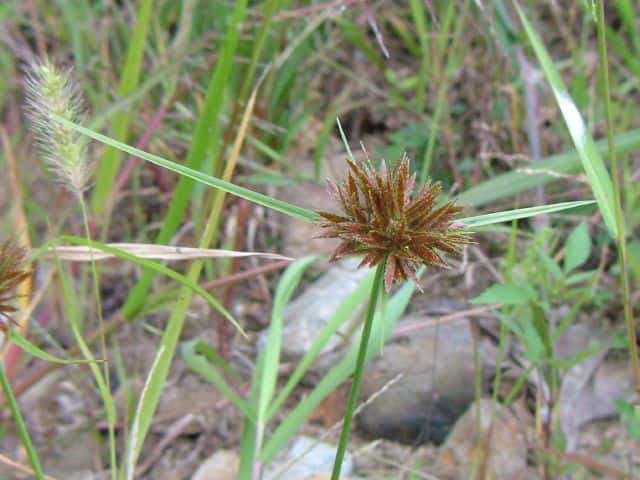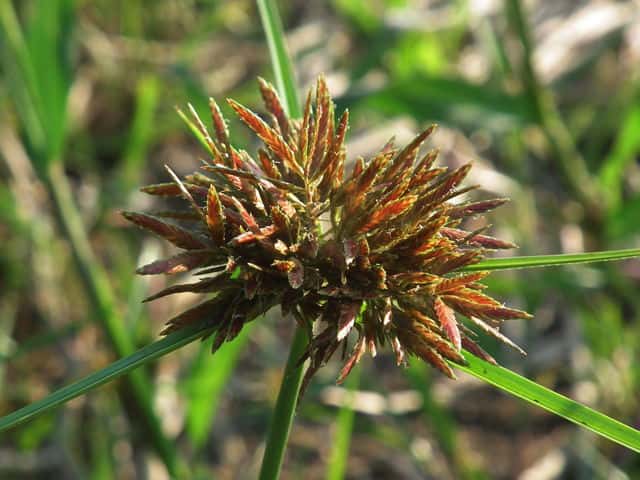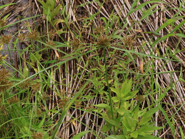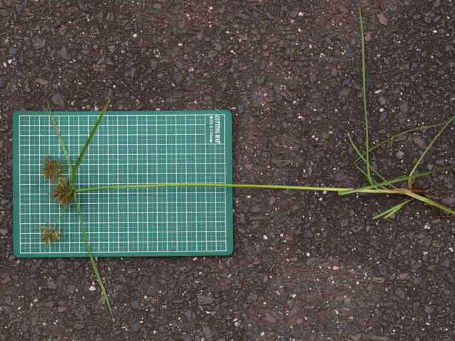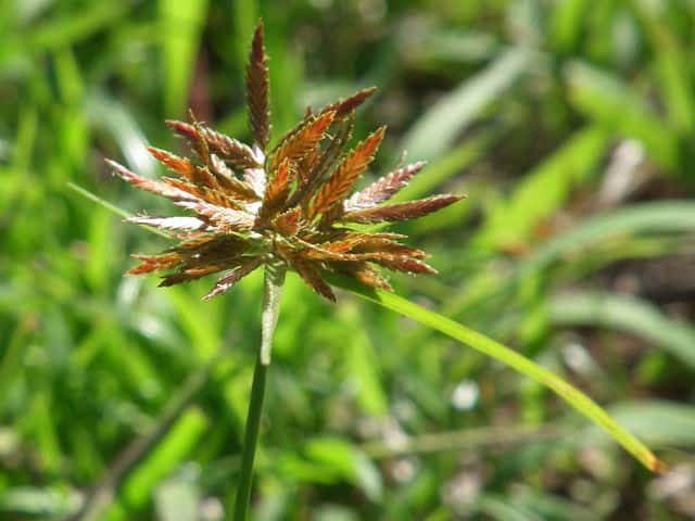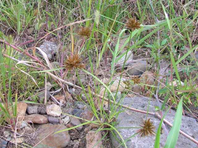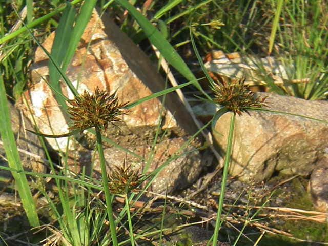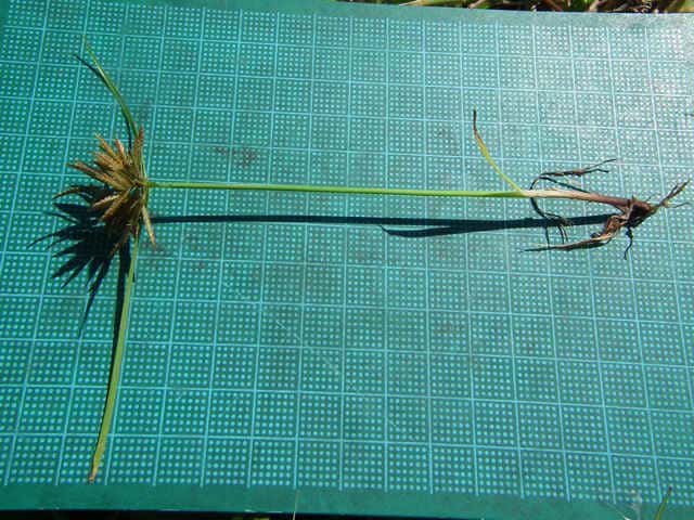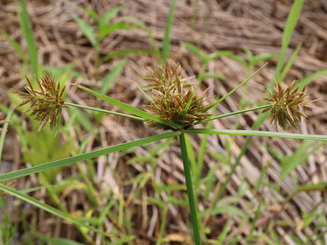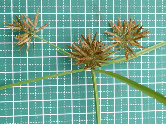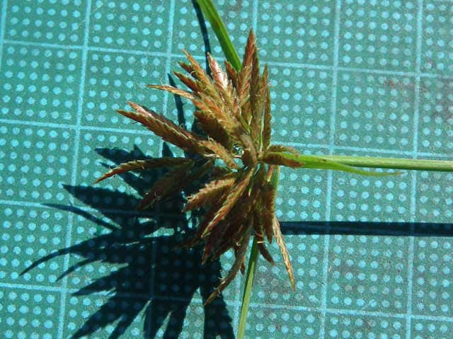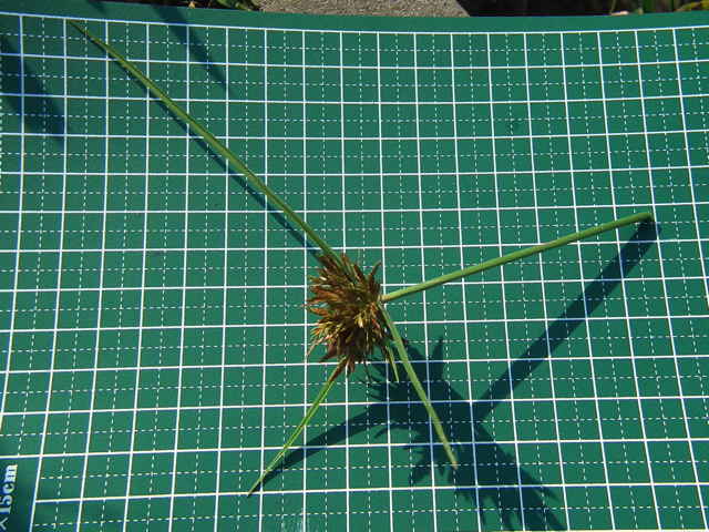 | 多年草 関東地方以西〜九州の海岸付近の日当たりの良い平地に多く見られる。植物体は叢生し、匐枝はない。稈は硬く、高さ10〜40cm、直立し、横断面は3稜形。葉は幅2〜3mm、稈より短い。基部の鞘は淡褐色。花序は普通頭状、小穂を密集する。苞葉の葉身は葉状、4〜6枚つき、花序より長い。小穂は密に多数つき、やや直立して扁平、長さ1〜2cm、披針形、鋭頭、一部は赤褐色を帯び、15〜40個花をつける。鱗片は狭卵形、長さ約2mm、鋭頭。そう果は倒卵形、長さ約1mm、上端はやや切形、熟すと黒褐色となり、稜が小穂の中軸に向く。花柱はそう果とほぼ同長。柱頭は2個。花期は7〜9月。(岡山県カヤツリグサ科植物図譜) 学名は、Cyperus polystachyos カヤツリグサ科カヤツリグサ属 |
