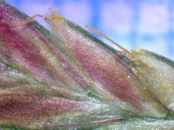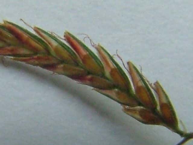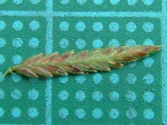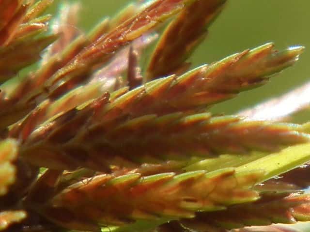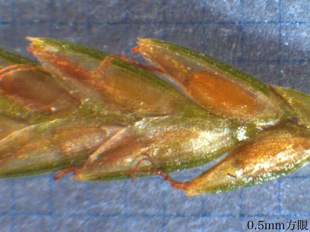 | ▼小穂は長さ約1cm。 | ▼鱗片から2岐した柱頭がのぞく。 | ▼鱗片は長さ約2mm。 |