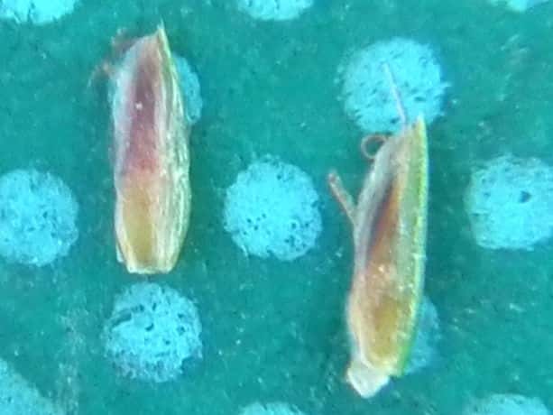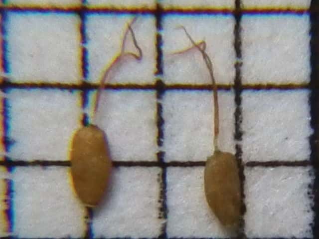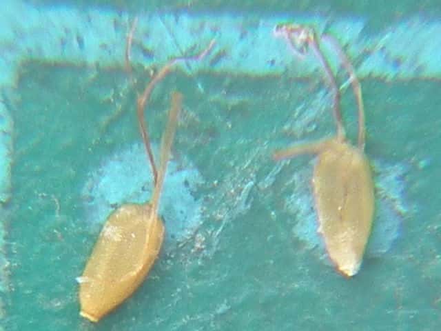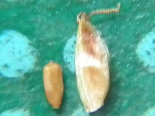 | ▼鱗片は長さ約2mm、果実を包んでいる。 | ▼果実は長さ約1mm、柱頭は2岐。 | |